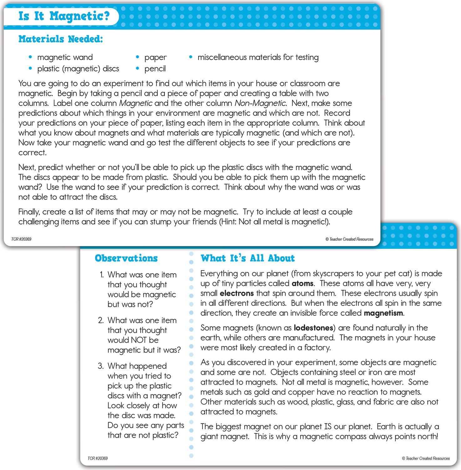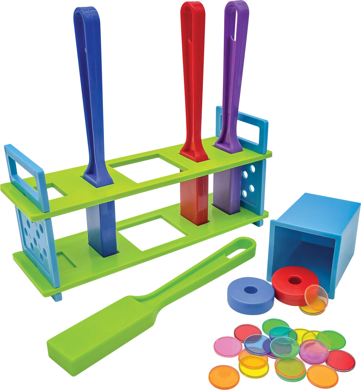 This science set comes with four easy-to-hold magnetic wands, two large ring magnets, and 20 colorful magnetically-receptive discs which all fit on a brightly colored storage stand. Use the five provided double-sided activity cards to help guide simple experiments using common household and classroom materials. Each card also includes observation questions and an introduction to basic scientific concepts. Perfect for stations or independent exploration.