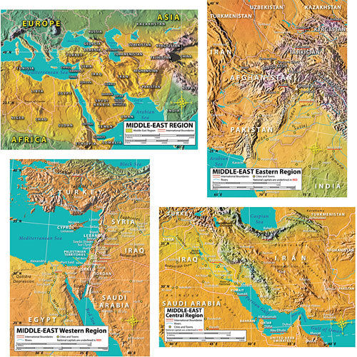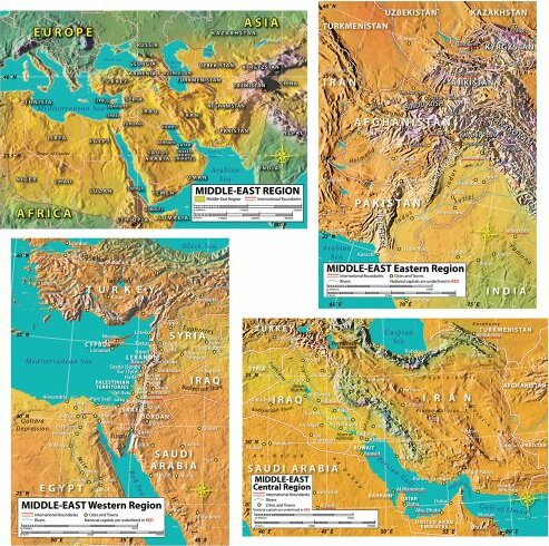 *4 maps (17" x 24" each) that include an overview map of the Middle East, as well as maps that zero in on the western (Mediterranean), central (Iraq and Iran), and eastern (Afghanistan and Pakistan) regions of the Middle East.