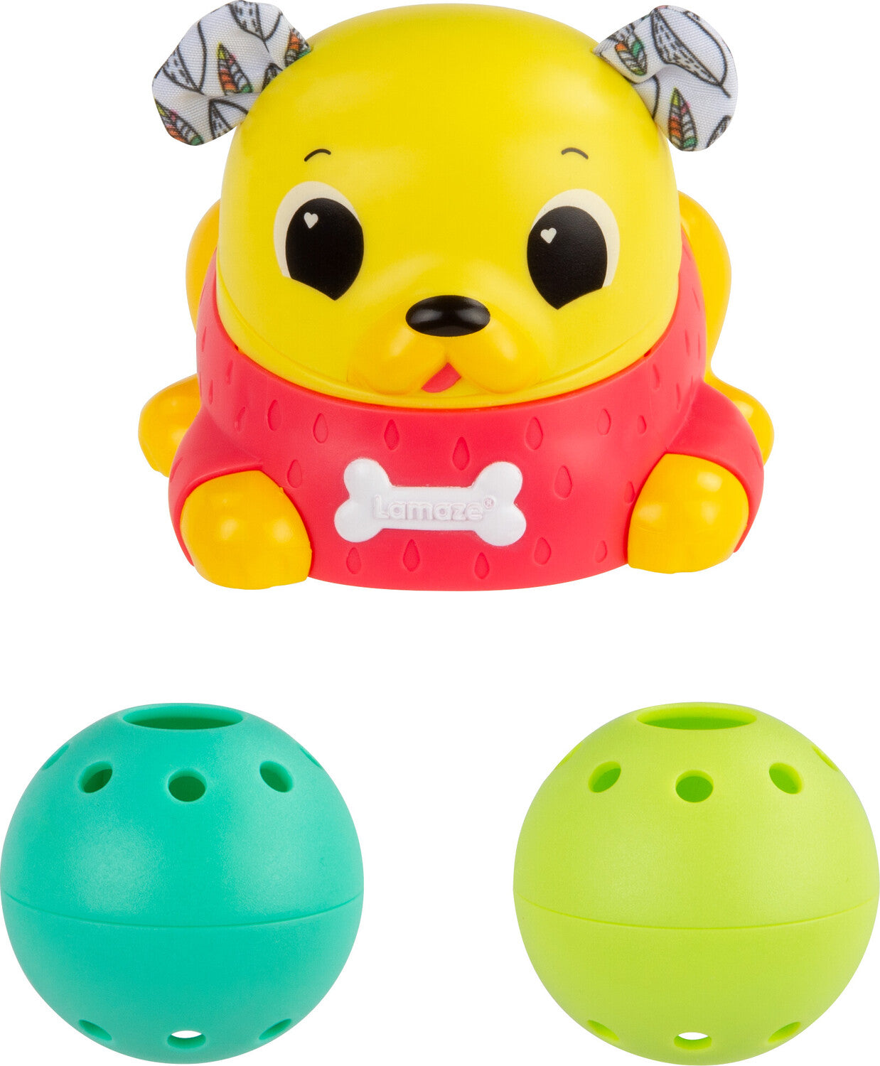 Press the pug over one of the two easy-grip balls and immediately it pops from its mouth to roll across the room.