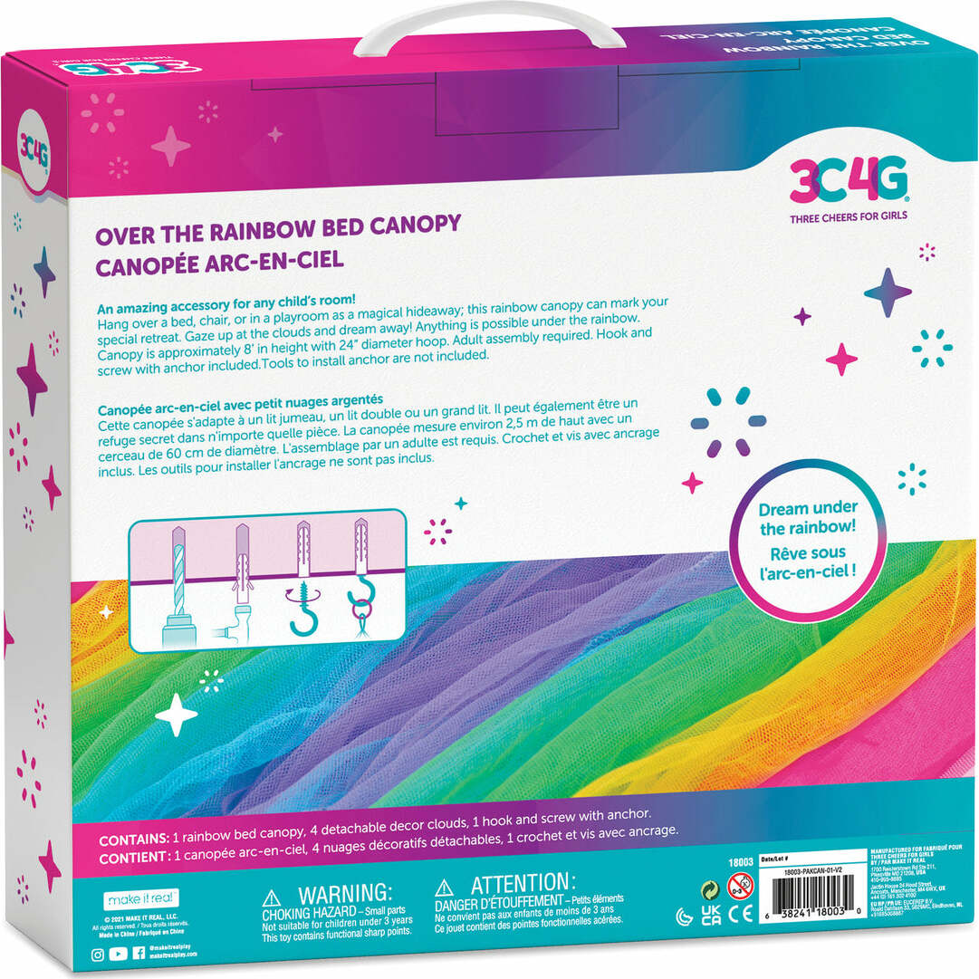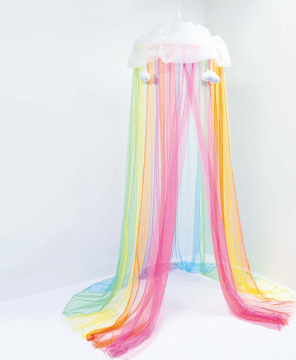 Turn any little one's bedroom into a magical scene with vibrant rainbow and cloud canopy. It's perfectly sized to fit over twin, full and queen-sized beds and comes complete with detachable cloud accents.