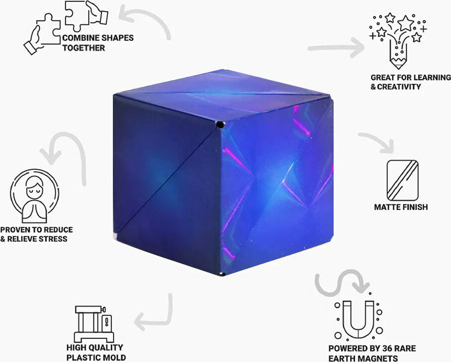 All Shashibo™ are made out from 100% recycled ABS injection mold plastic, tear-resistant stickers, and have 36 internal rare earth magnets enclosed within each cube! Both the ABS plastic and rare earth magnets are recyclable at the end of their life!