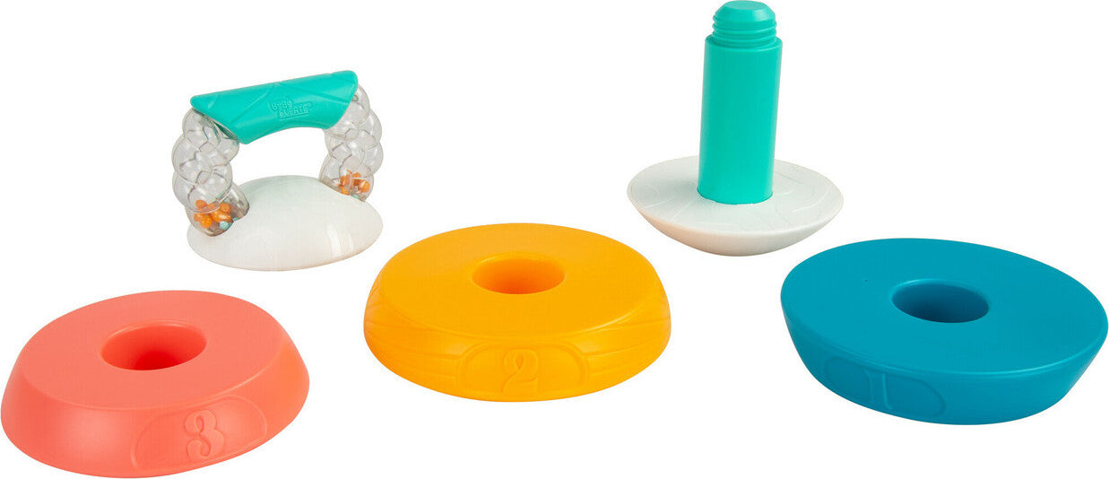 - Classic Stacking Toy with a Twist! Twist top onto the base to keep the pieces together and let baby join the work out fun with a kettlebell featuring fun rattling sounds
