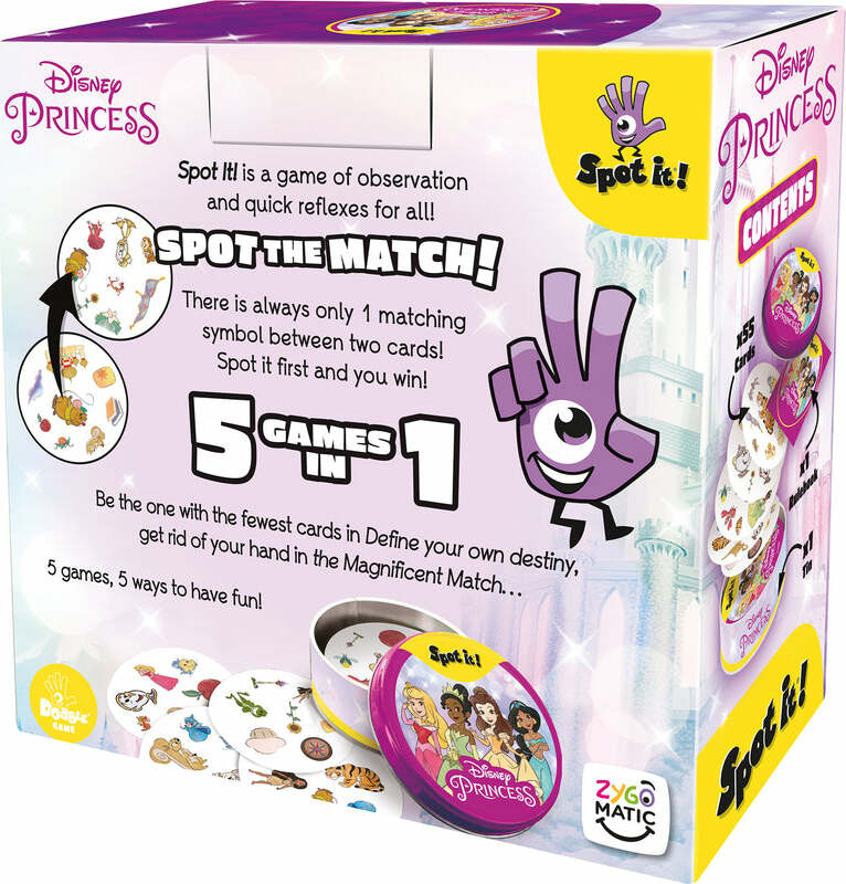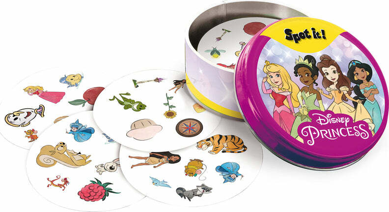 Spot It! Has 5 different ways to play, and this version of spot it features classic icons, items, and characters related to the beloved Disney Princesses.