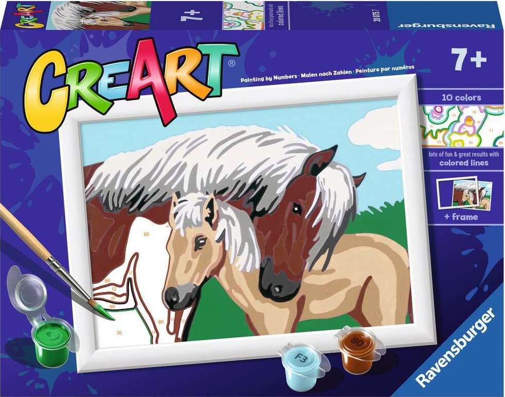 Create some calming down time for your young horse fan with this "Mother/Foal" CreArt paint-by-numbers kit! Kids can relax with this fun and satisfying activity, complete with everything needed to make and display their very own masterpiece. Success is simple, with color-outlined sections and matching, odorless acrylic paints to ensure picture-perfect results. Finish in about 4 hours, let dry, then use the included frame to proudly display your budding artist's talent!