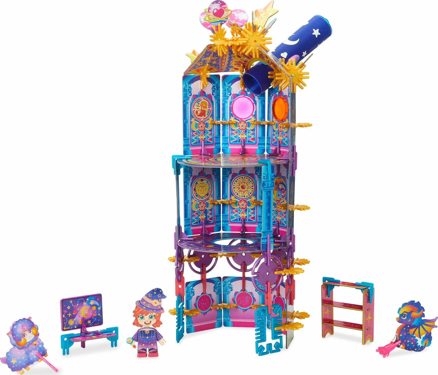 The Star Wish Tower includes over 150 pieces including Koral with two interchangeable and animated expressions, a pretend-play telescope tube with 3 interchangeable colored lenses, a lion, a dragon, a sheep, multiple accessories, and a sticker sheet with glow-in-the-dark stickers for decorating.