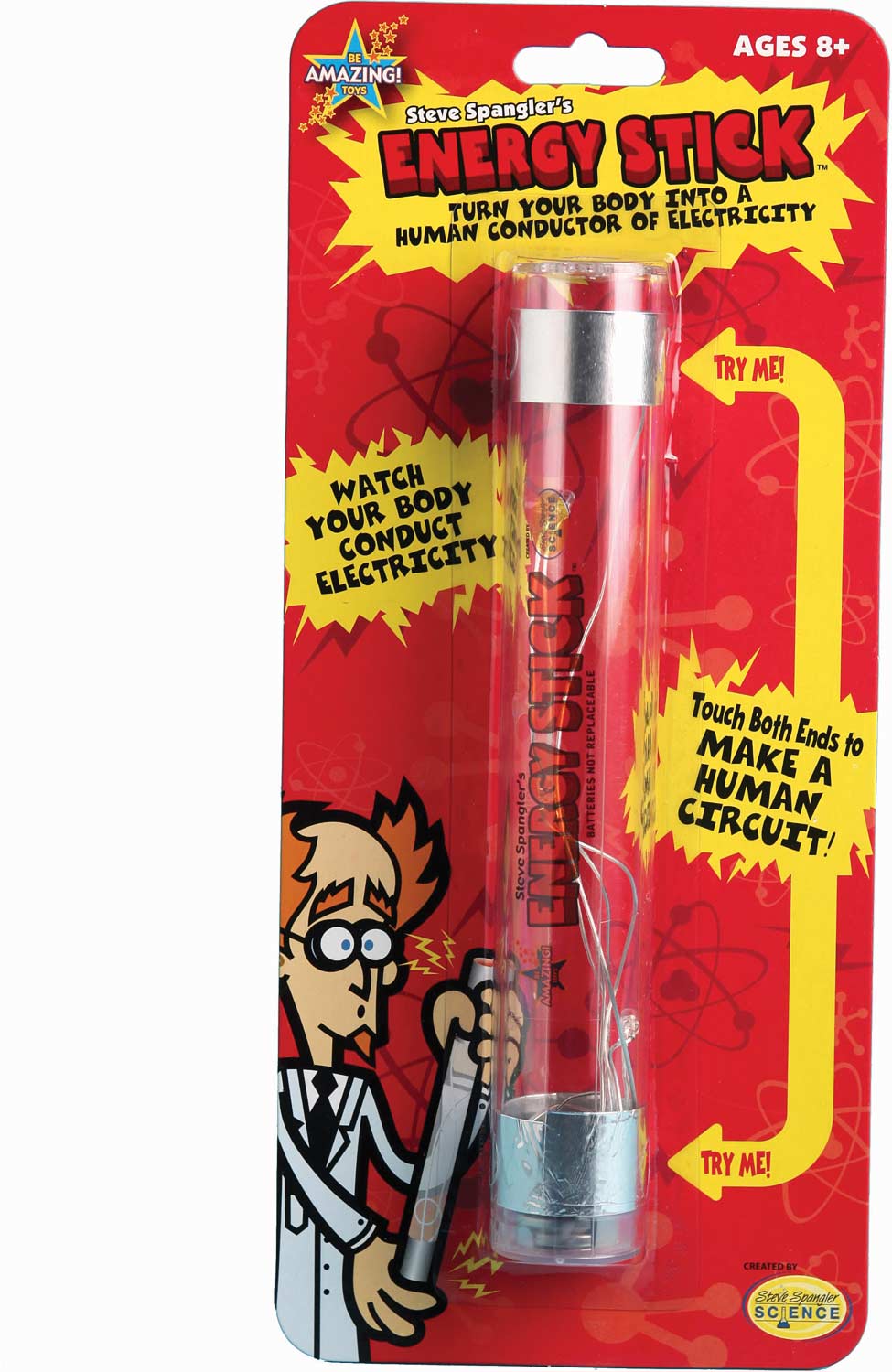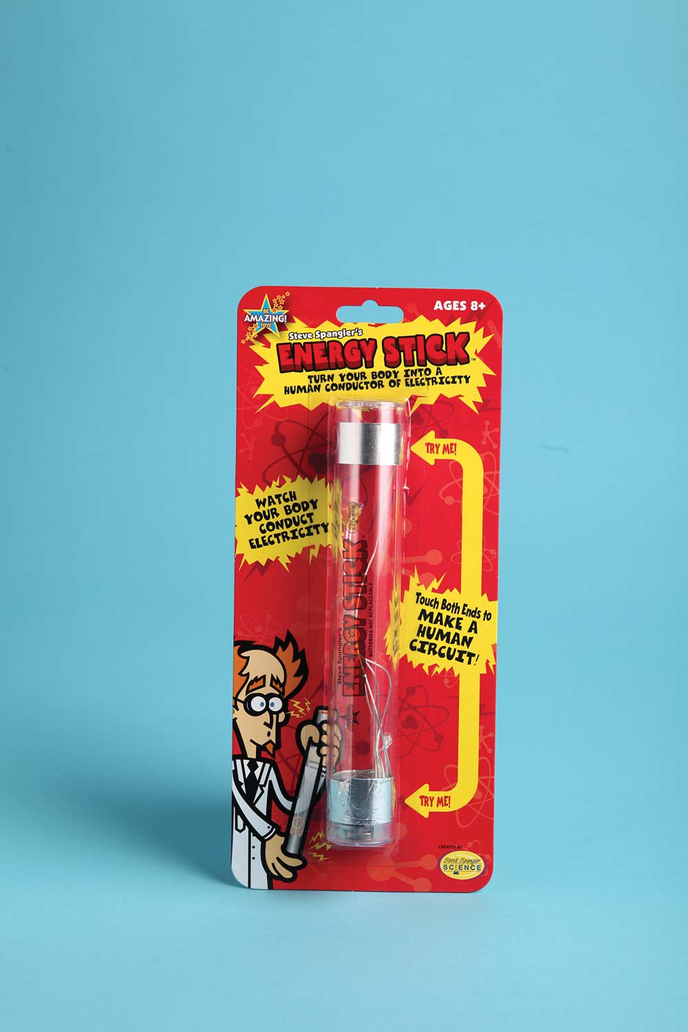 Do you think you are Electric? Do your friends get a "Charge" out of you? Does your body transmit electricity? Use our new Energy Stick to find out. Hold the Energy Stick in your hands and see if it lights up and makes noises. Try it with two people, three people, five or more! Learn about conductivity, insulators and electric circuits. It's really fun. Amaze your friends.