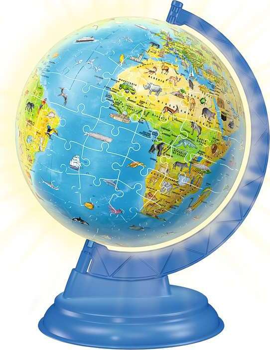 This 180-piece 3D puzzle comes complete with an additional 6-part stand, LED light and instructions. This puzzle illustrates the continents and some of the animals that inhabit them. Our unique plastic pieces slot together to build a sturdy and strong model; no glue required! Each puzzle piece is printed with a number on the reverse side, so you can assemble the puzzle by eye or simply follow the numbers.