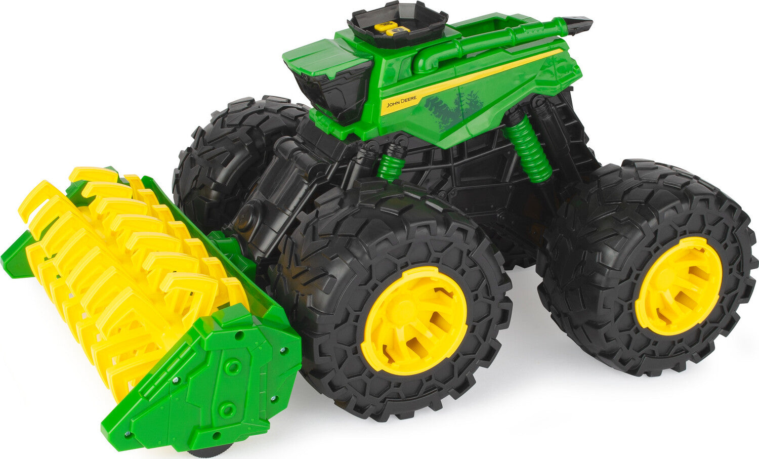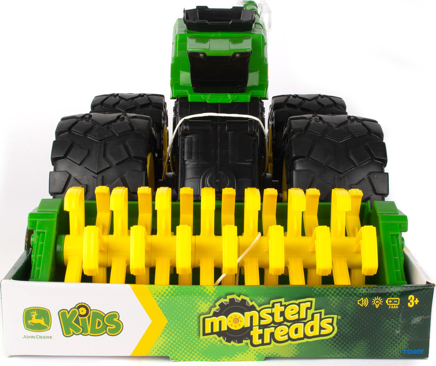 Go big or go home!  This ginormously scaled Monster Treads combine measures nearly 18 inches long x 10.50 inches wide x 9.50 inches tall and is the largest Monster Treads toy ever created!  It also features lights and sounds activated by three different buttons.  Additionally, it features super bouncy tires, uniquely designed tire treads and a spinning combine head that is activated by rolling the combine forward.  The best of both worlds collide when the power of John Deere meets monster vehicle styling!