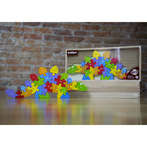 The 26 piece friendly Stegosaurus teaches letters with fun puzzle play. Once built this stegosaurus can stand on his own for more play fun. This brightly stained puzzle is carefully crafted from plantation grown rubber wood and is sure to bring hours of fun and learning to your preschooler. The Dinosaur A to Z Puzzle comes with an easy clean up storage box made from Beech wood.