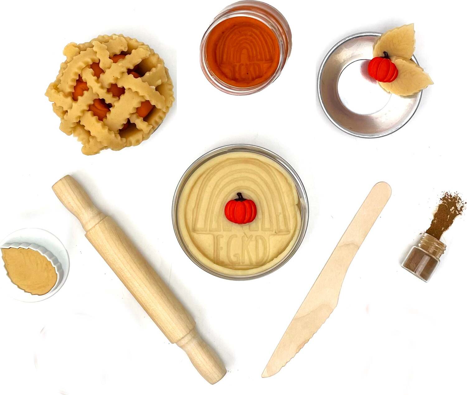 This Pumpkin Pie Play Kit includes a half pound jar of Pie Crust KidDough with charm, a 2 ounce mini jar of KidDough "filling" (orange/pumpkin), wood rolling pin, wood rolling wavy pie cutter, jar of spices, decorative leaf plunger, apple form, and wood knife.