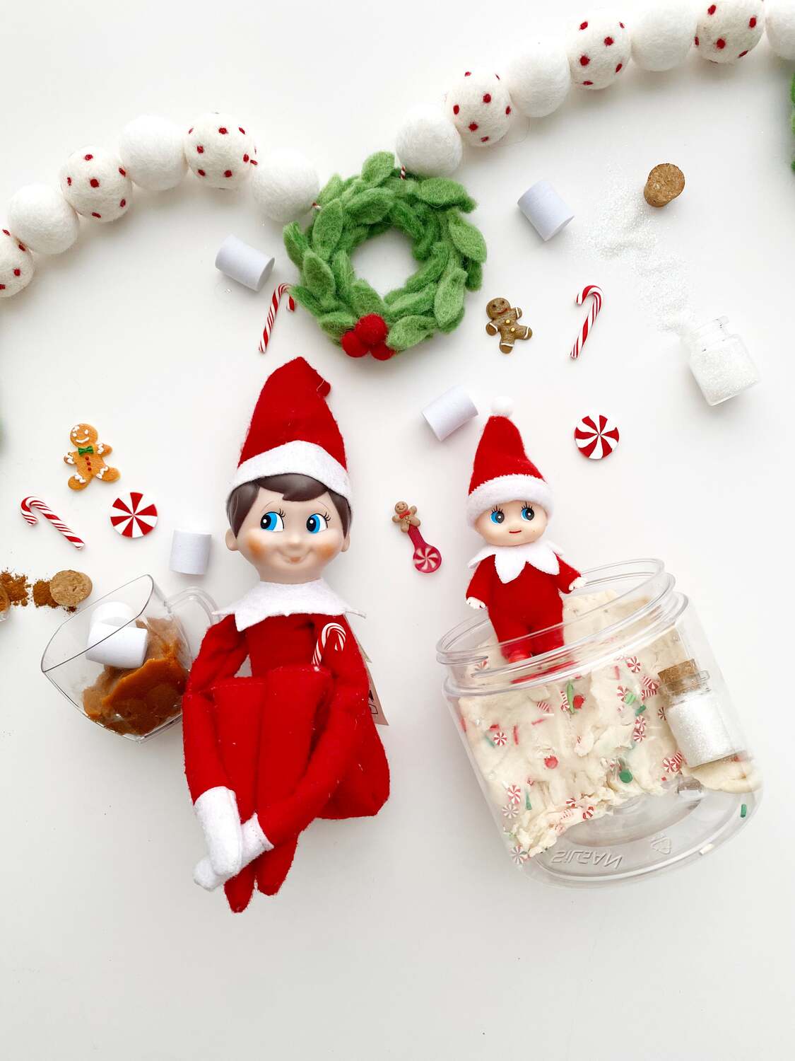 8 Ounces of Marshmallow KidDough withbaby Elf figurine and Hot Cocoa making Dough Activity.