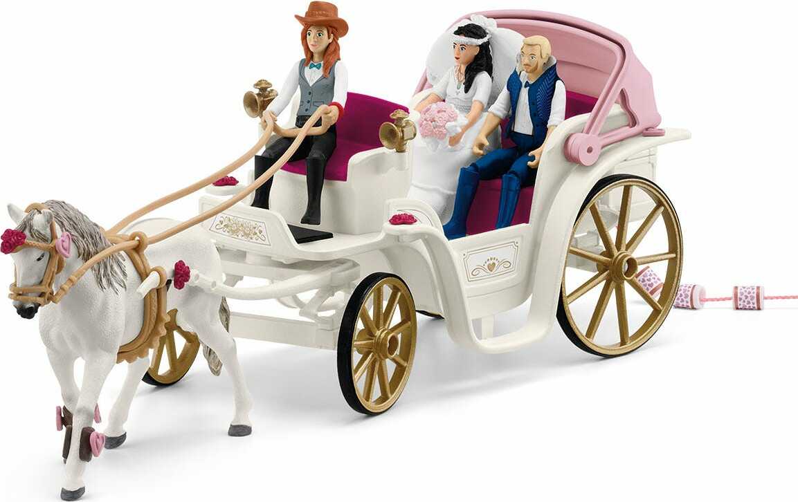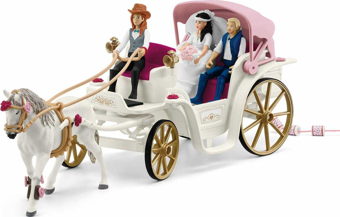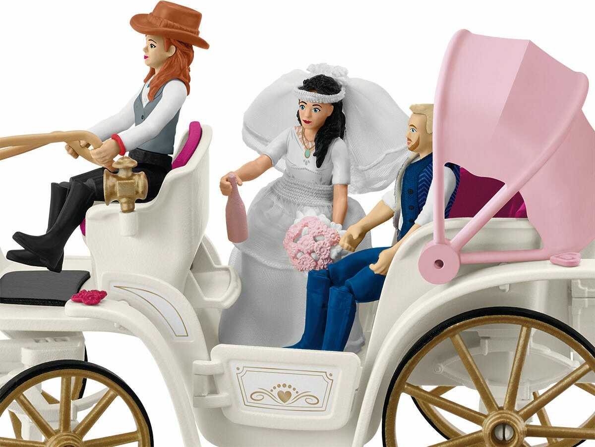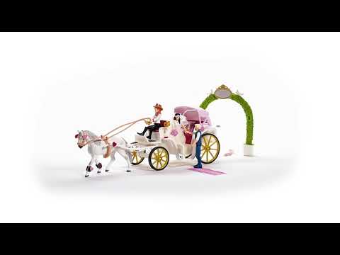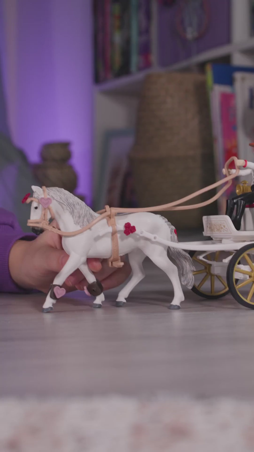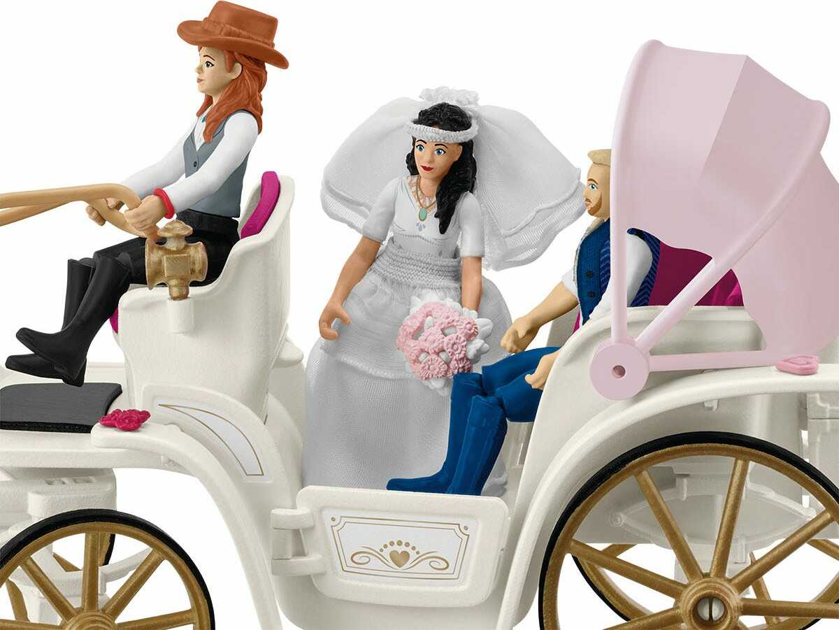Emily looks adorable in her wedding dress. The groom Toby has also dressed up. Together they climb into the wedding carriage, to which a whole bunch of empty clanking tin cans are attached. Hanna has decorated the Lipizzaner and the carriage to make everything look festive. The horse is wearing gaiters with hearts on and the bridle is also decorated with hearts. The bridal couple make themselves comfortable on heart-shaped cushions in the carriage and toast each other with champagne. What is this? There's a secret hiding compartment under the seat! There are some apples tucked away for later, so the horse can be rewarded for its hard work.