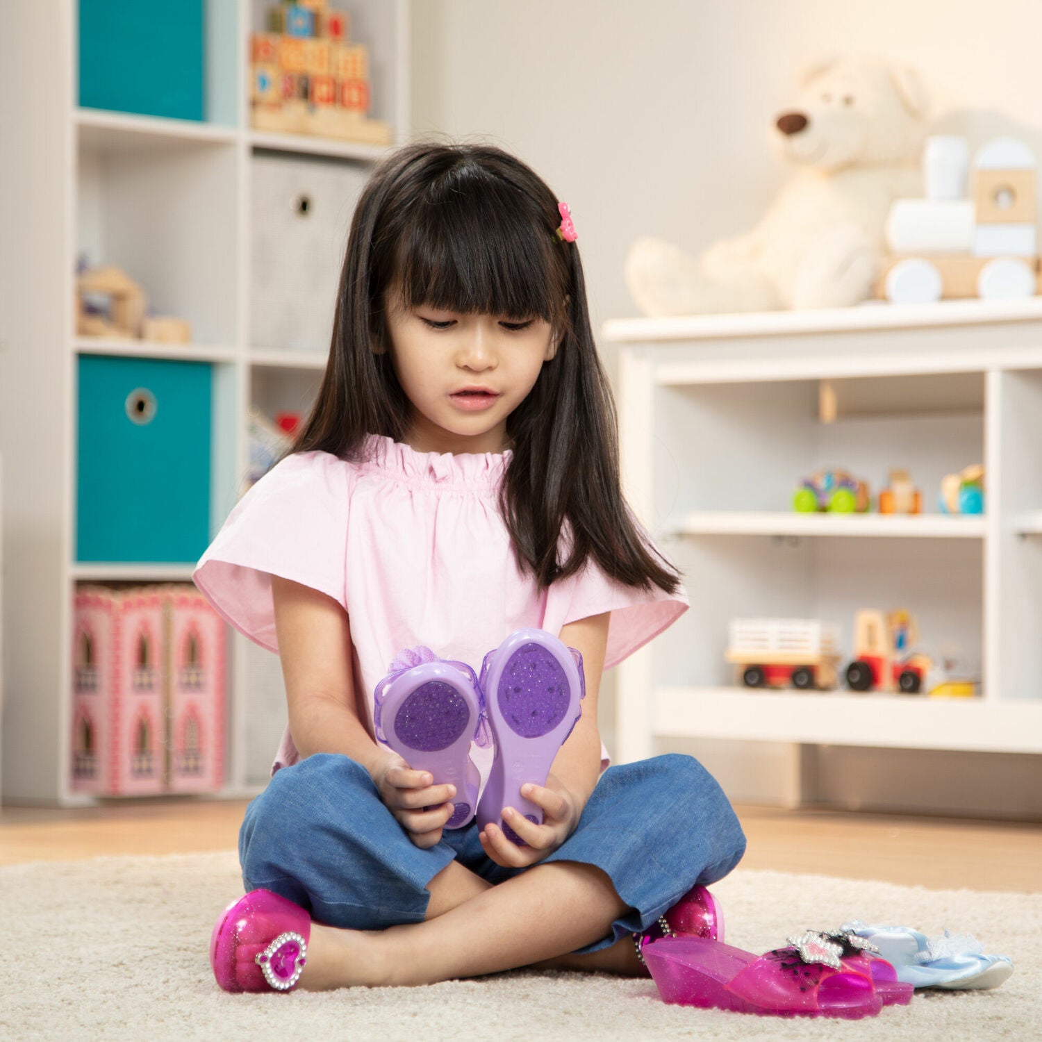 Regular price $29.99Four pairs of play shoes in one stylish set! These high-quality dress-up shoes are made to fit comfortably, look great, and last for years. With four exciting styles--Elegant Princess, Prima Ballerina, Magical Fairy, and Rocker Girl--kicking off a pretend-play adventure is as easy as putting on a pair of pretty shoes! Wear them confidently for playtime--the rubber soles resist slips and the durable construction will stand up to adventure after glamorous adventure. Fits ages 3-5. Coordinates with Melissa & Doug's Goodie Tutus dress-up skirt collection and Crown Jewels dress-up tiara collections.