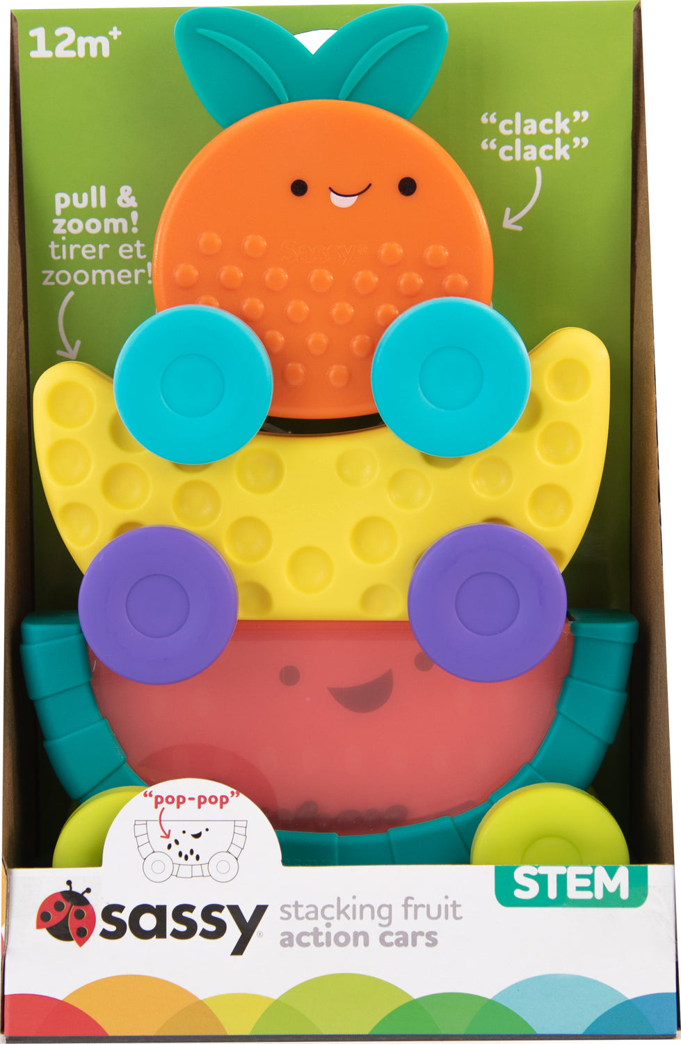 Regular price $25.99- 3 piece stacking cars, can be stacked on top of each other in orange, banana, and watermelon order