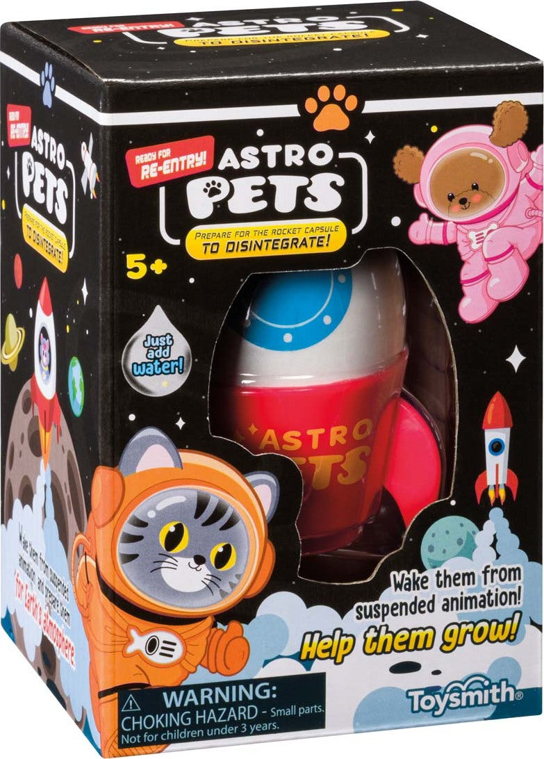 Just add water to wake these adorable astronaut pets from their suspended animation. Each Astro Grow Pet kit includes one of four brightly colored and adorable astronaut animals. A fun science and animal toy for kids 5+, the Astro Pets water-grow kit is one kids want to buy multiple times to try to collect all four. Every Astro Pet kit includes a red, white, and blue rocket ship that dissolves in water to reveal a surprise squishy astronaut animal inside. May reveal a pink kitty, brown dog, or tan fox.