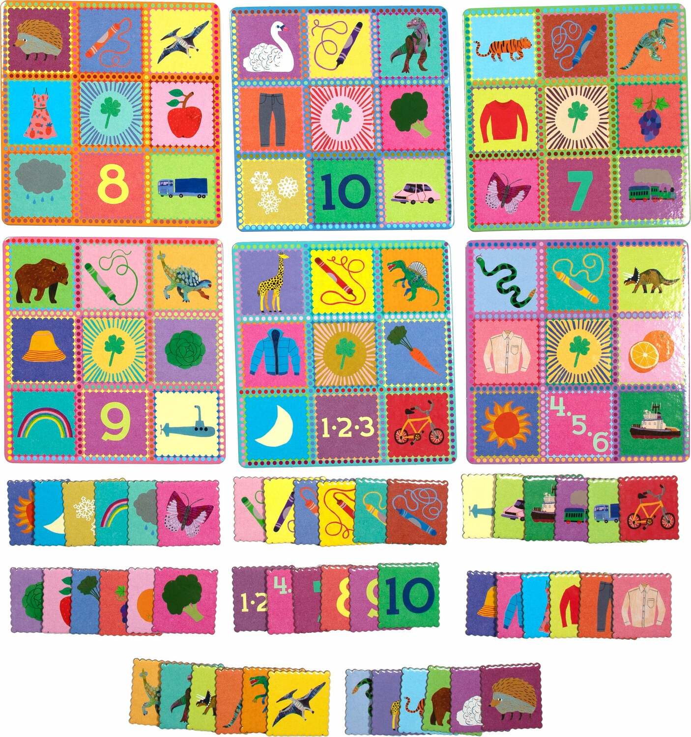 Regular price $20.99A simple bingo game featuring images of familiar things divided into 8 clear categories: colors, numbers, vehicles, food, clothing, things at home, things in the sky, and dinosaurs, featuring joyful and bright artwork. A great multi-generational activity for family play. A great tool for practicing simple vocabulary.