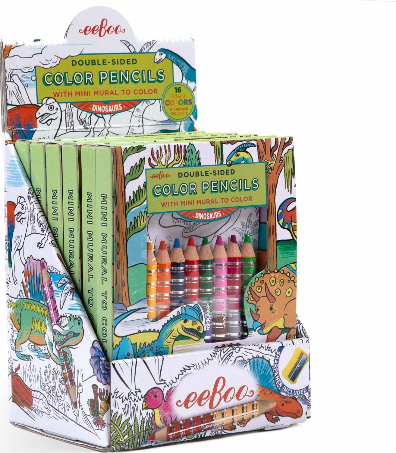 High quality color pencils with 16 colors with a long and detailed fold-out mural to color, filled with dinosaurs and prehistoric plants.