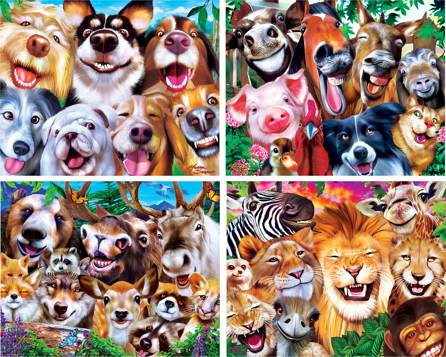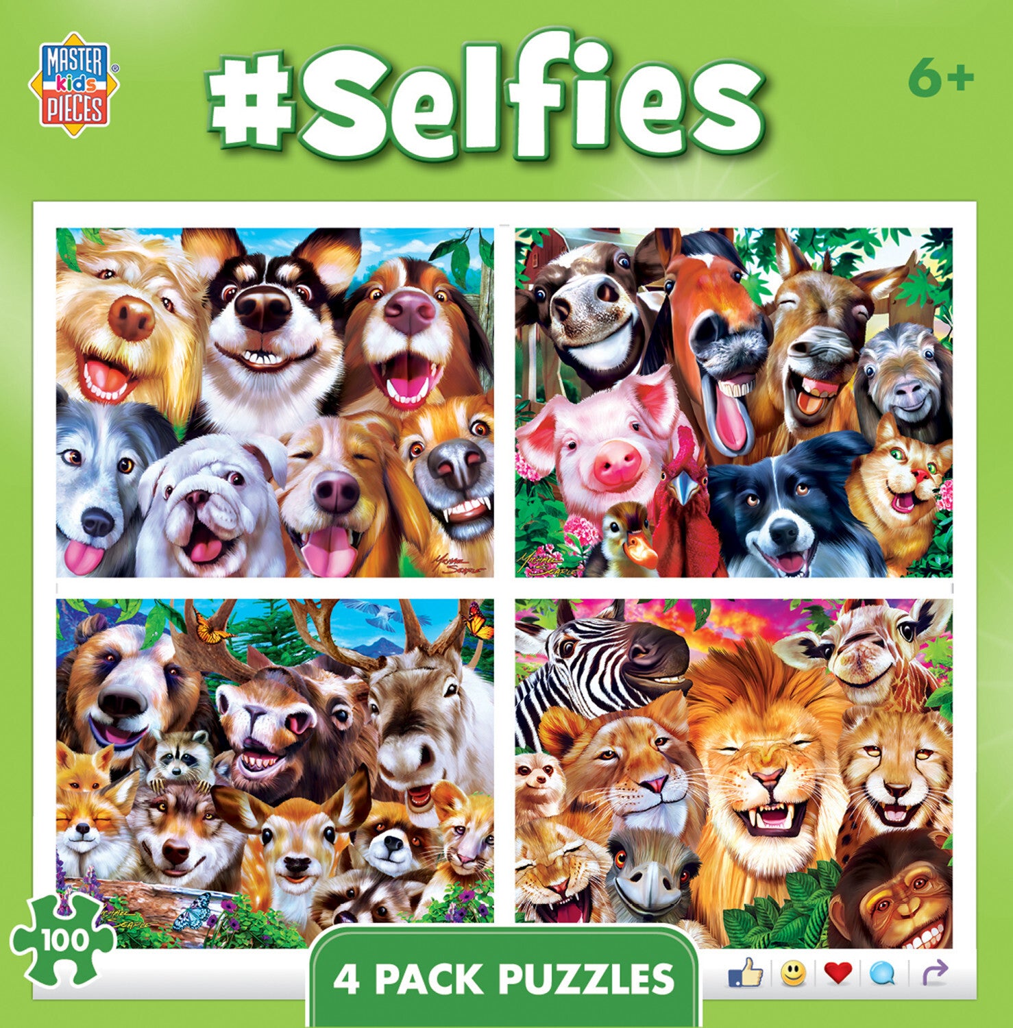 These MasterPieces 8" x 10" Selfies 4-Pack Multi-Pack Kids Puzzles include four Selfies 8" x 10" 100pc puzzles, and are perfect for all children, ages 6 and up. All four puzzles feature silly animal Selfies, including safari, woodland, farm, and pet animals.