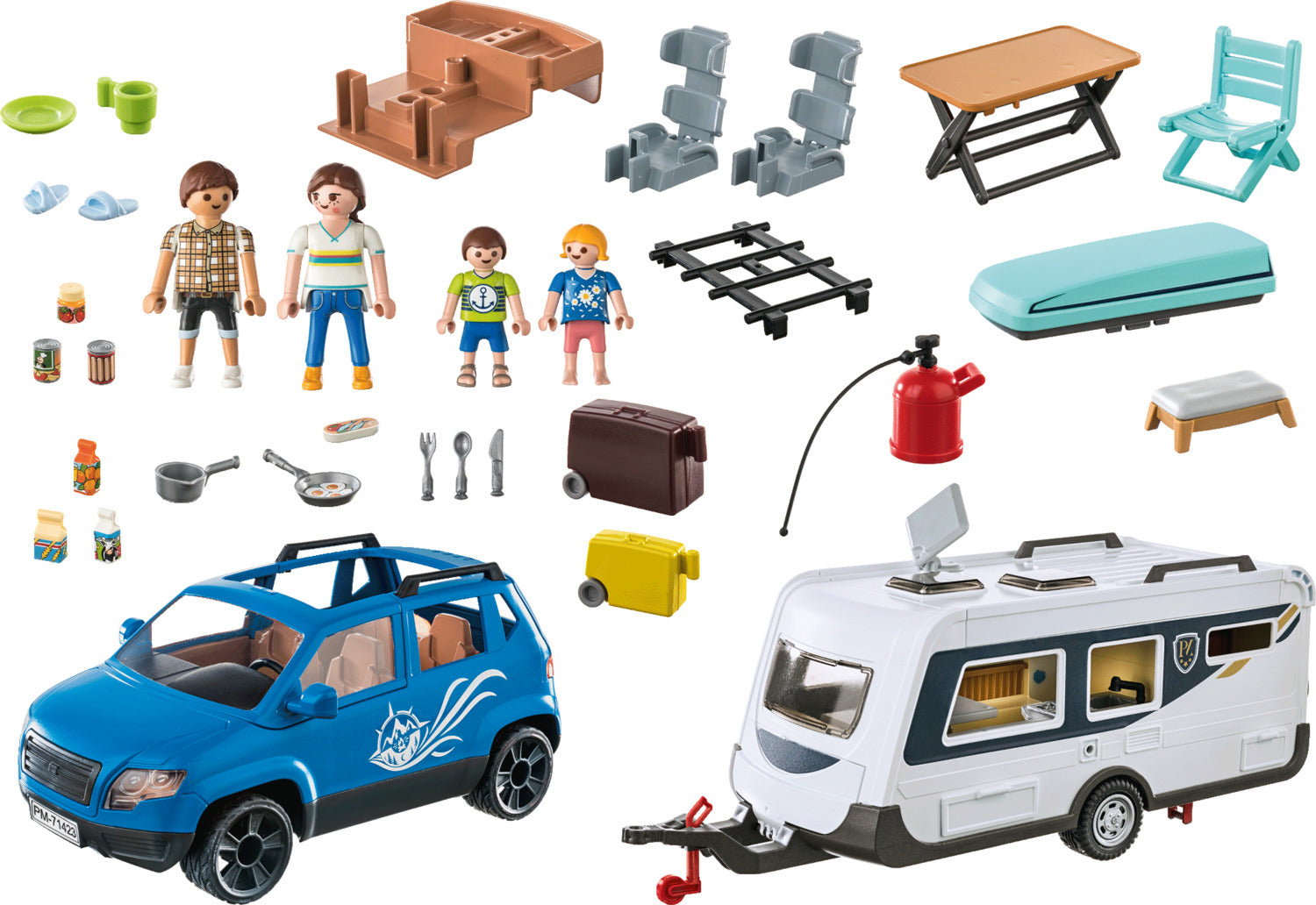Figure: 1 woman, 1 man, 2 children; Accessories: 1 car, 1 caravan, 2 suitcases, 4 chairs, 1 table, 1 pan, 4 plates, 4 cups, 2 beverage bags, 1 flour bag, 2 cans
