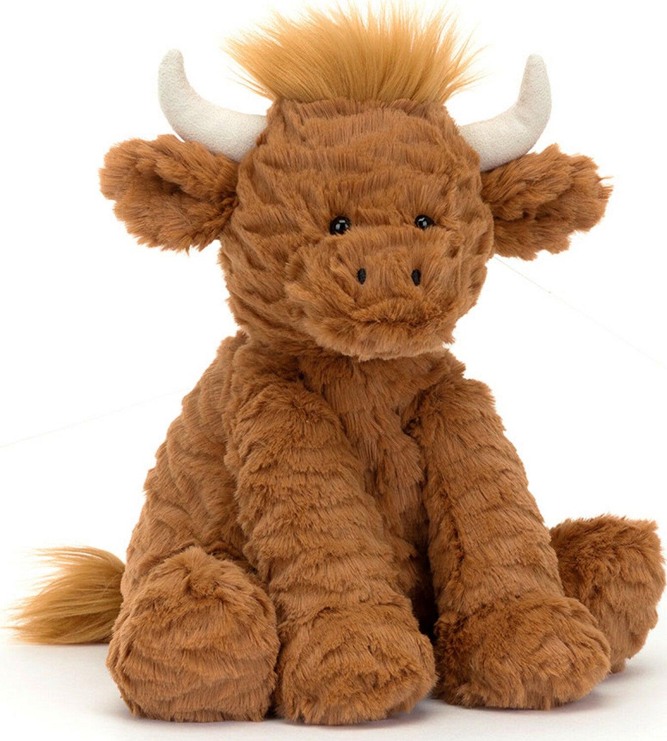 Fuddlewuddle Highland Cow is charmingly tousled in toffee fur. This playful calf has a silky mane in gorgeous punky tufts, as well as gentle fold ears, soft, weighted hooves and two vanilla suedette horns. Bright-eyed and tassel-tailed, this rumpled friend can sit up to listen or sprawl out for a nap.