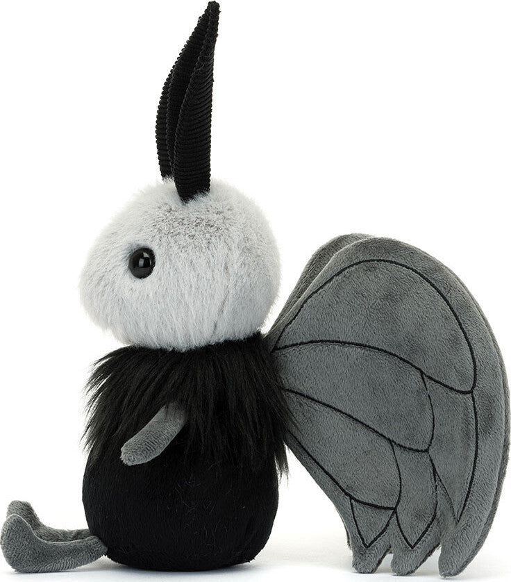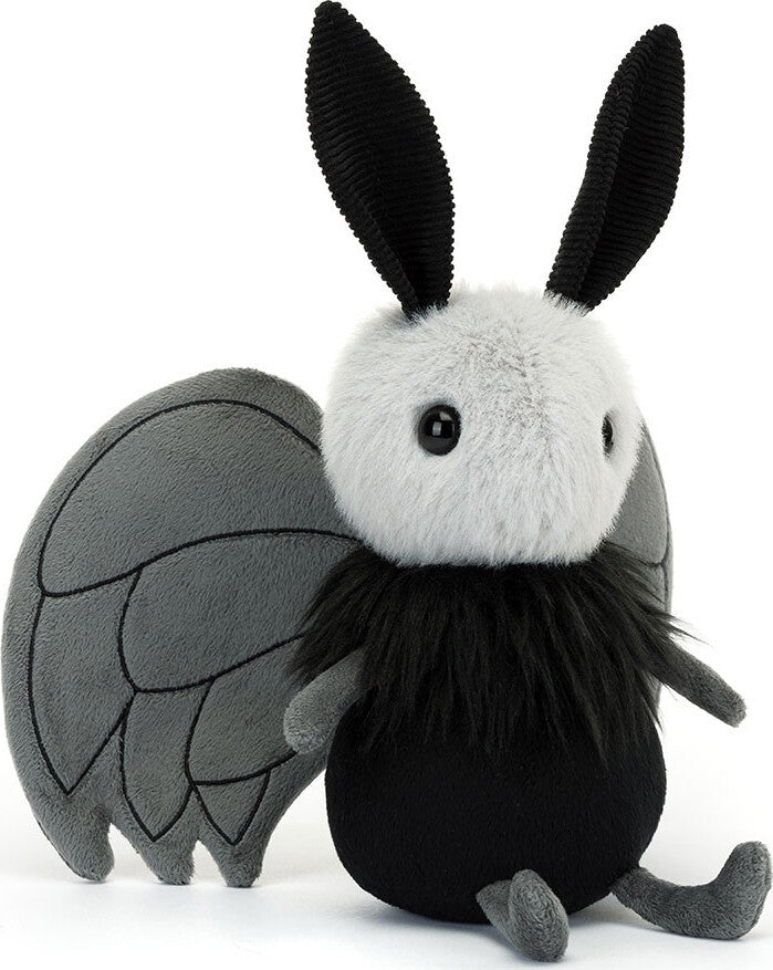 When twilight comes, look out for Miff Mothman! This mythical friend has a silky black tummy, embroidered slate wings with scalloped edges and a fuzzy pebble head with cord antennae. A quirky gift with so many textures, Miff's bright-eyed, cord-booted and fit to flit!