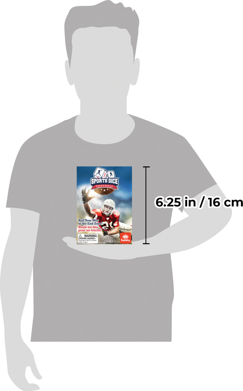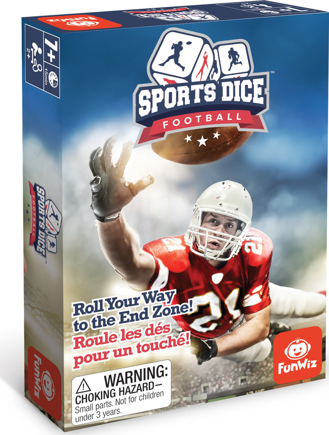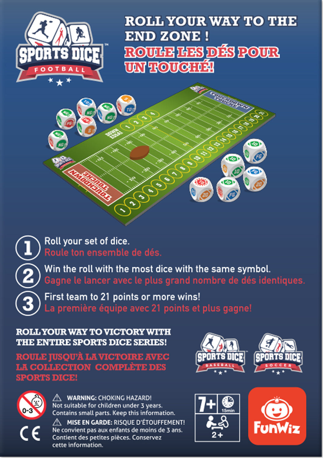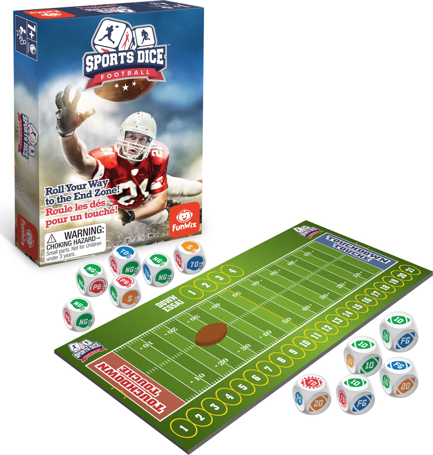 Regular price $17.99Roll into the action in this easy to learn and quick to play dice game for 2 or 4 players. Sports Dice Football includes all the drama of a real game. The team that starts on offense starts on their own 25-yard line. They have 4 downs to get to the 50-yard line or beyond. Once they reach (or cross) the 50-yard line, they receive a new set of downs and now have 4 tries to get to the opposing team's end zone and score. Both teams simultaneously roll all their dice. The symbol that appears the most on each team's set of dice becomes their play. The team that rolled the most dice with the same symbol wins the roll and proceeds with their play. In the event of a tie, the team with the Power chip may use it to win the contest or let the other team proceed. The game ends when one team has scored 21 points or more. Sports Dice Football is the perfect game for all football enthusiasts ages 7 and up.