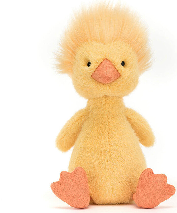 Jellycat Dorit Duckling is the star of the pond in bold yellow fur. With a funky yellow hairdo, Dorit has little wings and a high tail. With a soft orange beak and matching long legs, this duckling loves going for a waddle.