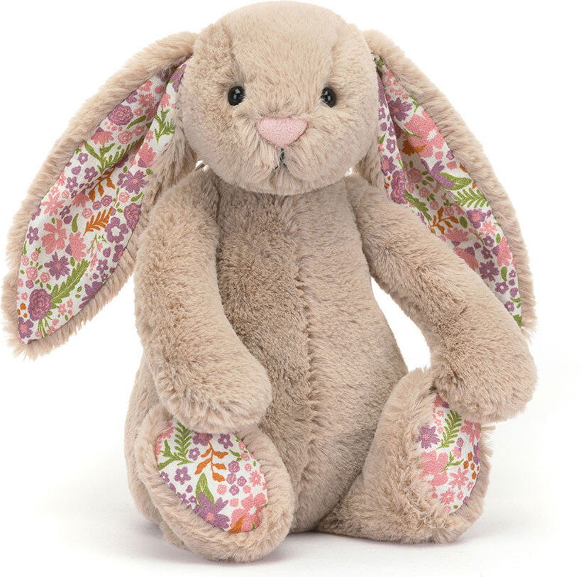 Blossom Beige Bunny has been frolicking in the meadows, and has found some special flowers. In iconic Bashful beige fur with a cream bobtail, Blossom Beige Bunny has soft cotton floral ears and feet, printed with an original Jellycat design of pink and purple flowers. Bringing floral patterned joy to all ages!