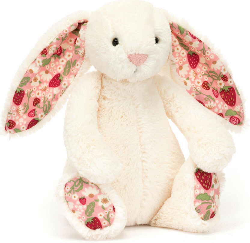 Blossom Cream Bunny has been berry picking in the fields. In iconic cream Bashful fur, Blossom Cream Bunny has soft cotton ears and feet, printed with an original Jellycat design of juicy strawberries and cream flowers on a pink backdrop. Bringing the joy of summertime to you all year long!