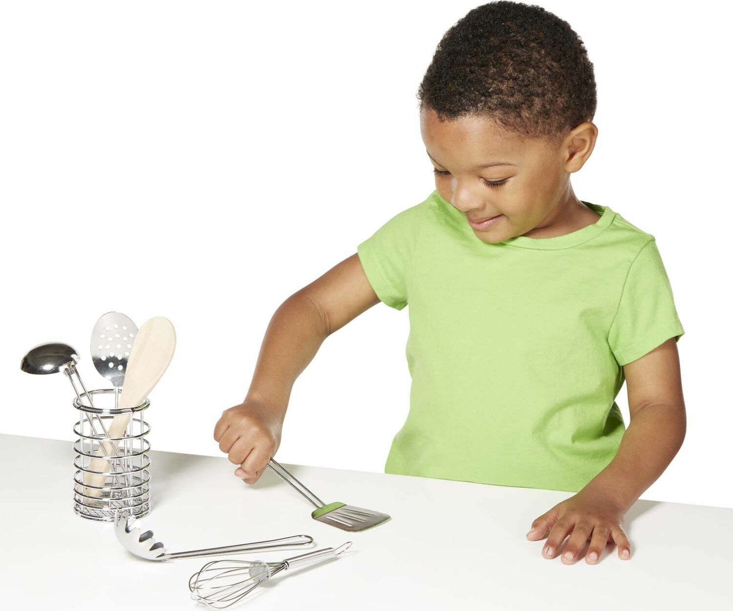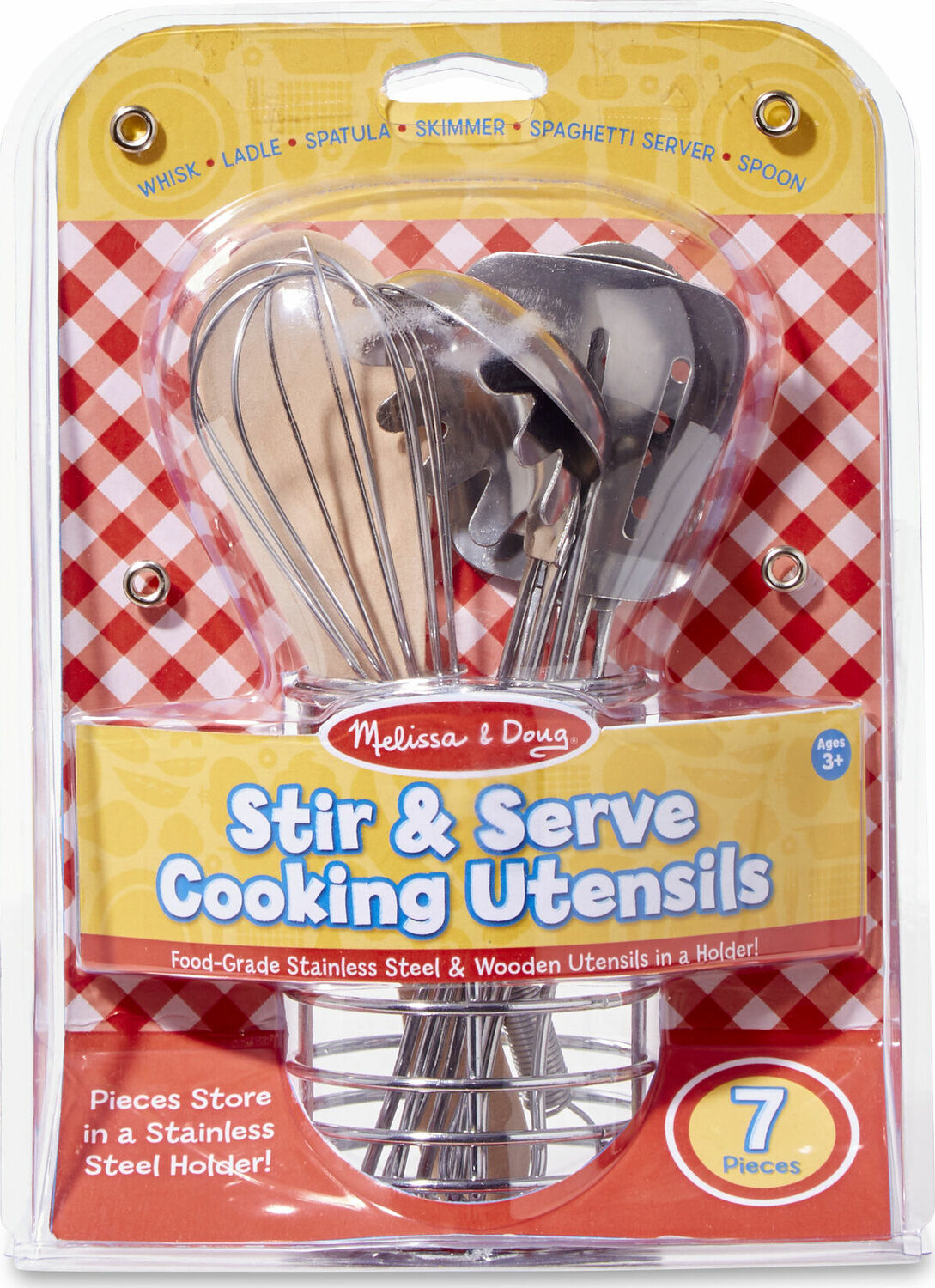 Melissa & Doug Stir and Serve Cooking Utensils (7 pcs) - Stainless Steel and Wood