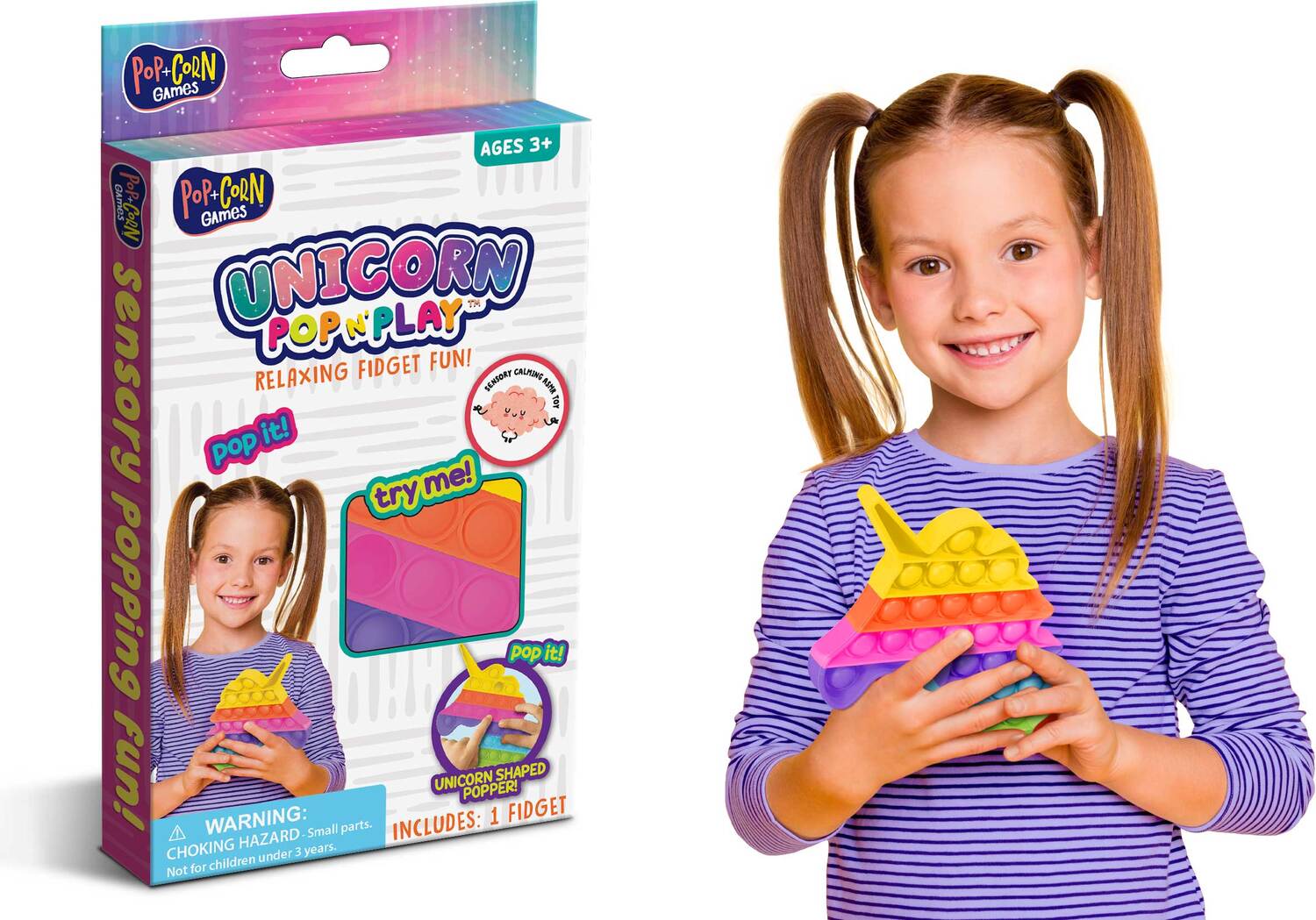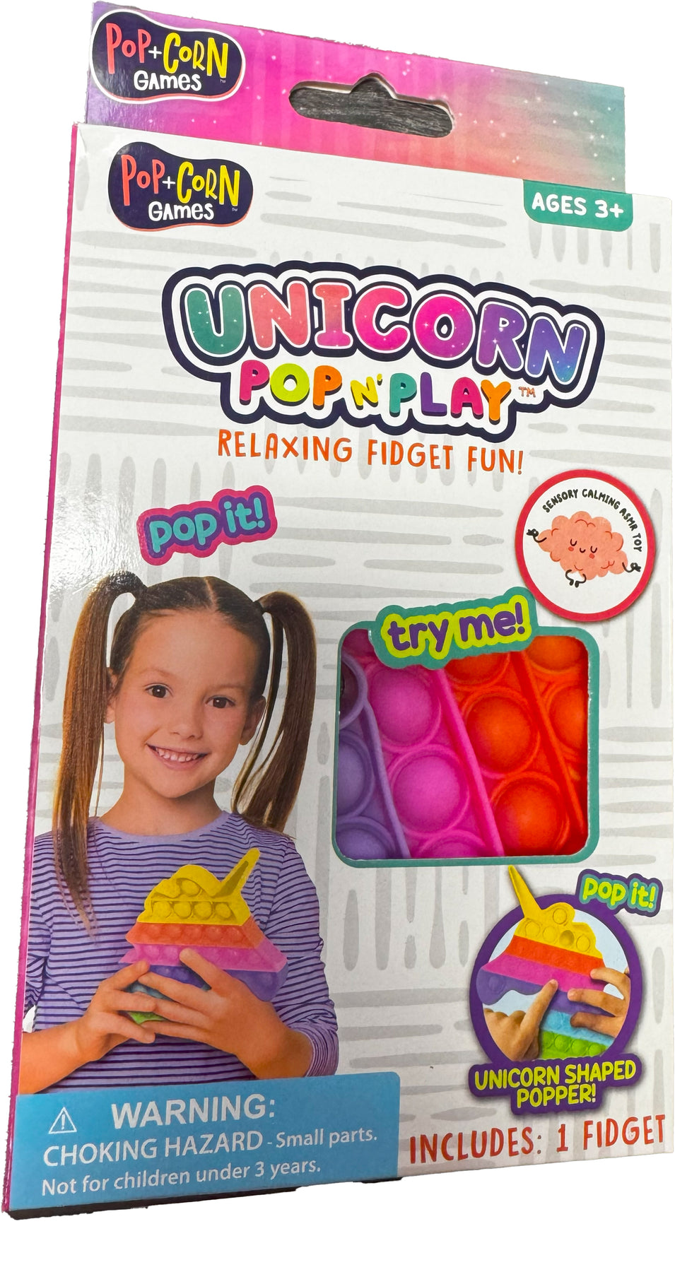 Regular price $4.99Unicorn-shaped Fidget Popper. Popper measures 5" x 5.11". Multi-colored. Packaged in a box with a Try-Me cutout. Ages 3+.