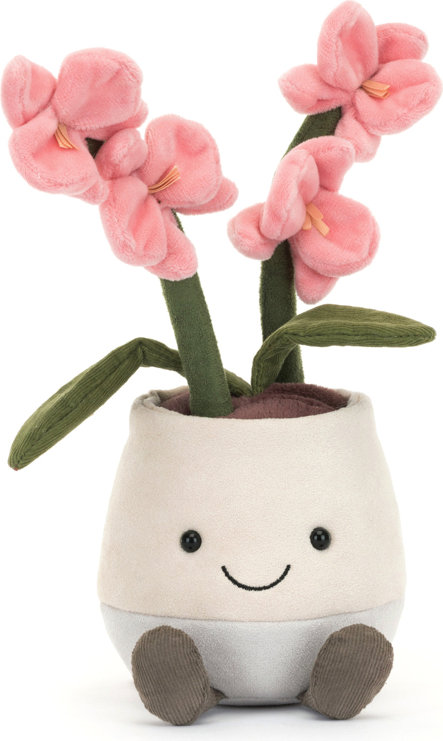 Regular price $52.99Amuseables Pink Orchid brightens up any room! Bold pink flowers with pale orange columns sit on sturdy, suedette stalks with matching leaves, all nestled in a pot of fuzzy cocoa soil. In a trendy, two-tone pot, this sweet orchid has charcoal fine cord legs, and a big, stitched smile to bring joy wherever it sits.