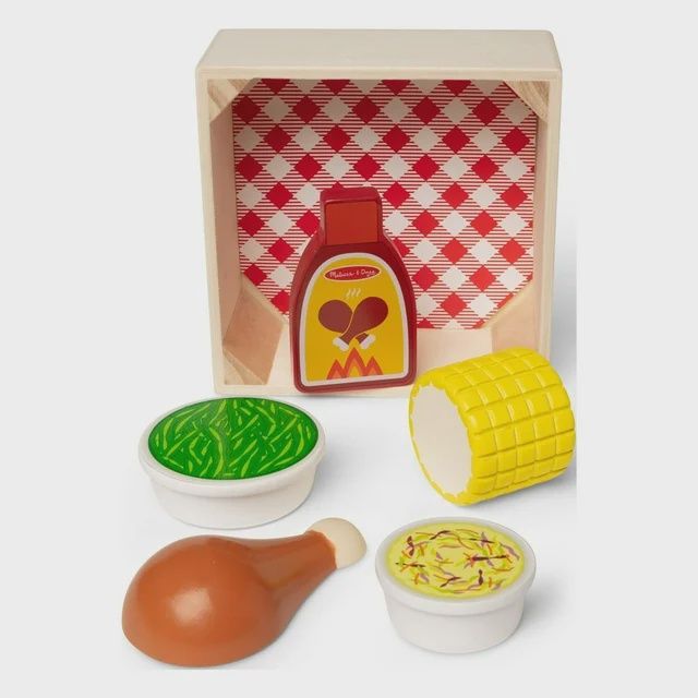- 5-piece set includes half a chicken leg, BBQ sauce bottle, green beans, coleslaw, and corn cob