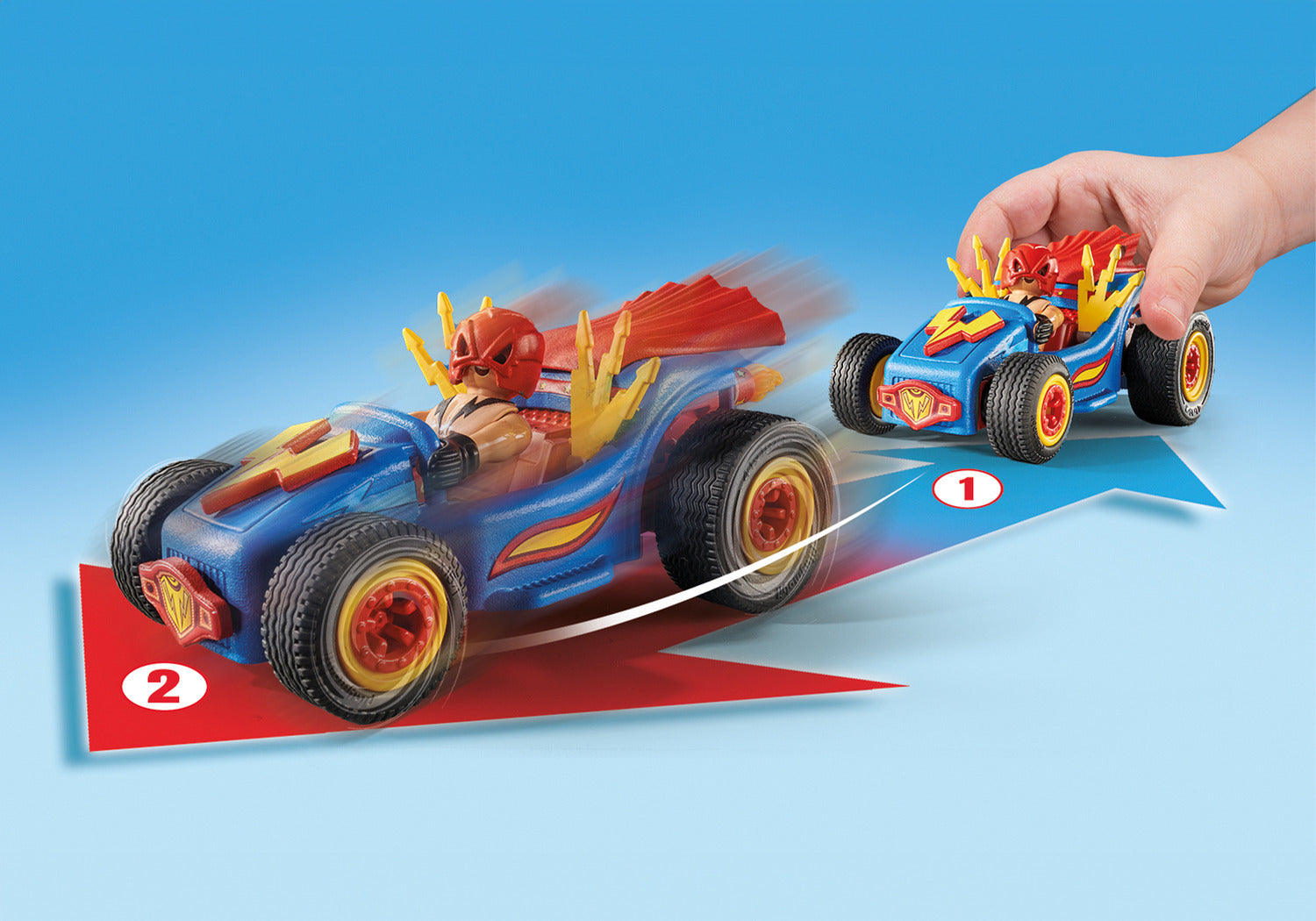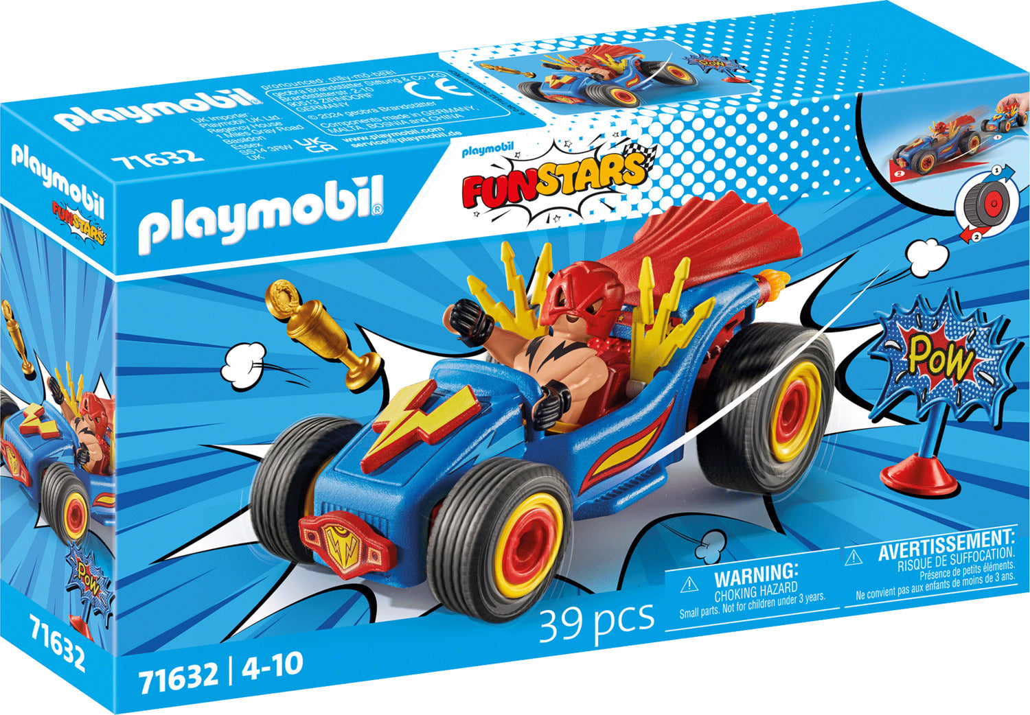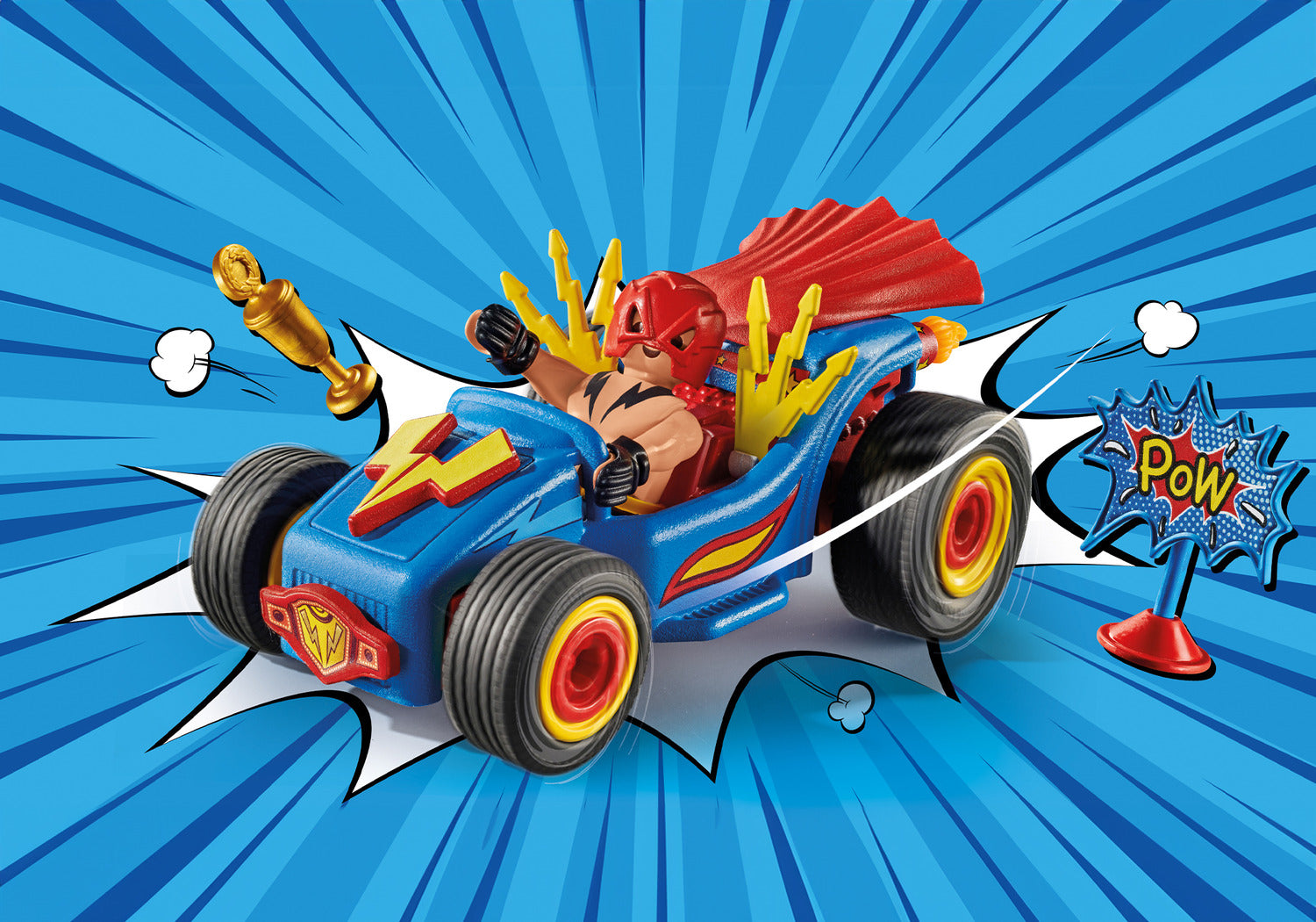Regular price $26.99On your marks, get set... Without hesitation, the wrestler zooms off in his kart with a retractable motor. Engage in a race with vivid flashes, fluttering capes, fiery exhausts, effortlessly leaving competitors behind. Exciting races, navigating obstacles, or crazy stunts - the Playmobil Funstars are here! This crazy Playmobil car will thrill all wrestling fans. The dynamic new body can be outfitted with various accessories. There's room for a Playmobil figure inside the vehicle. With the convenient retractable motor, high-speed play adventures are guaranteed. A fantastic gift or souvenir for car-loving children aged 4 and up.