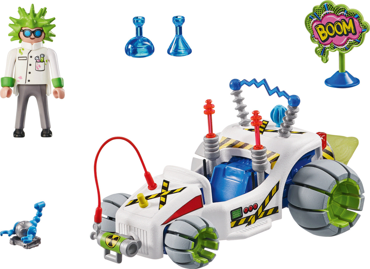 Figures: 1 man; Accessories: 1 kart with crazy accessories, 1 shield, 2 laboratory glasses