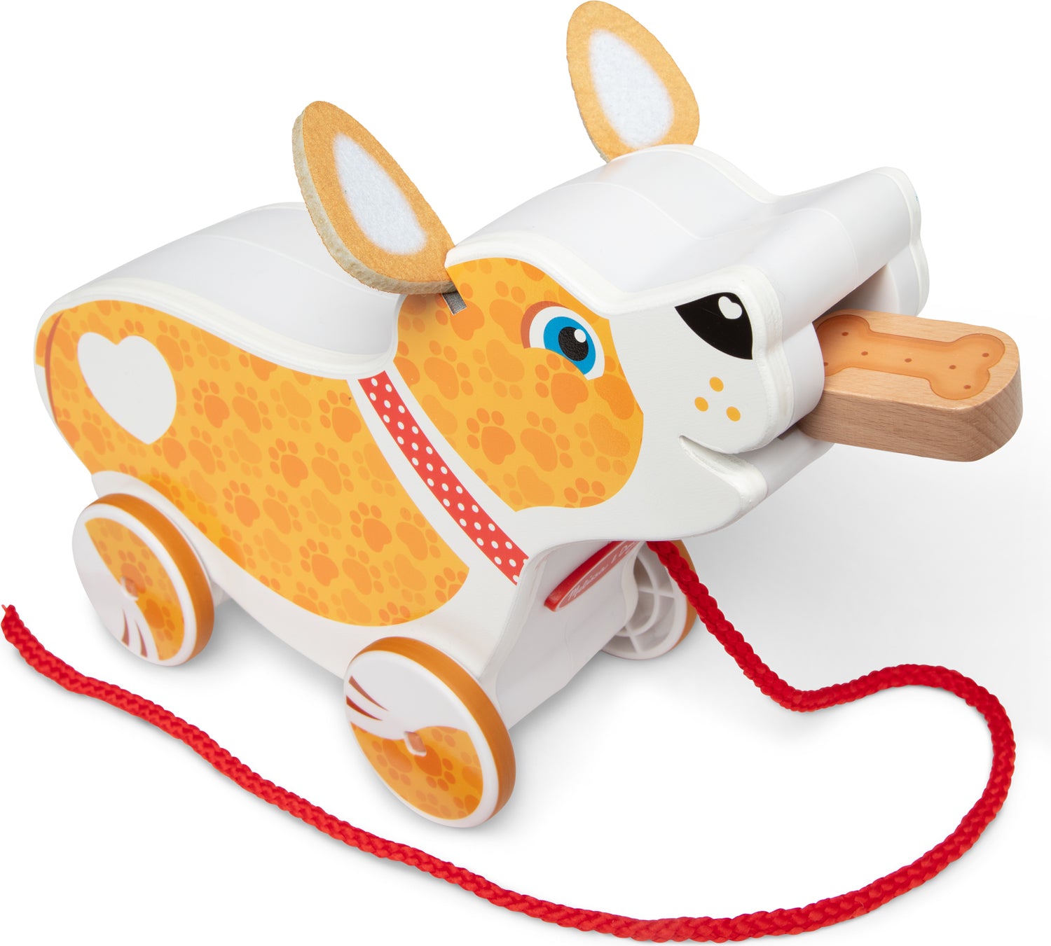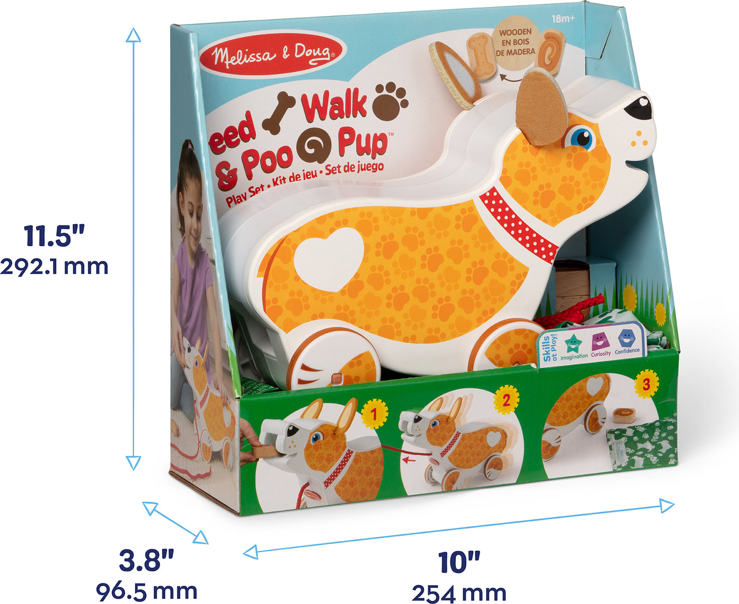Regular price $32.99This wooden pull-toy from Melissa & Doug is sure to have little animal lovers zooming around the room and giggling with joy! Feed the adorable pooch one of the three wooden dog “treats” (bone-side up), then use the attached leash to take it for a rolling stroll. After about eight feet (2.4 meters), the piece magically flips over inside the pup and comes out poo-side up! Treats store in a fun reversible bag that doubles as a poo bag for cleanup! Help teach kids 18 months and older responsible pet care (and the concept of cause and effect), while encouraging movement, building confidence and motor skills, and fostering curiosity and imaginative pretend play. This product is certified by the Forest Stewardship Council. FSC certification ensures that products come from responsibly managed forests that provide environmental, social, and economic benefits, and that forests are protected for future generations. Please note that FSC certification applies to new inventory only (FSC C156584)