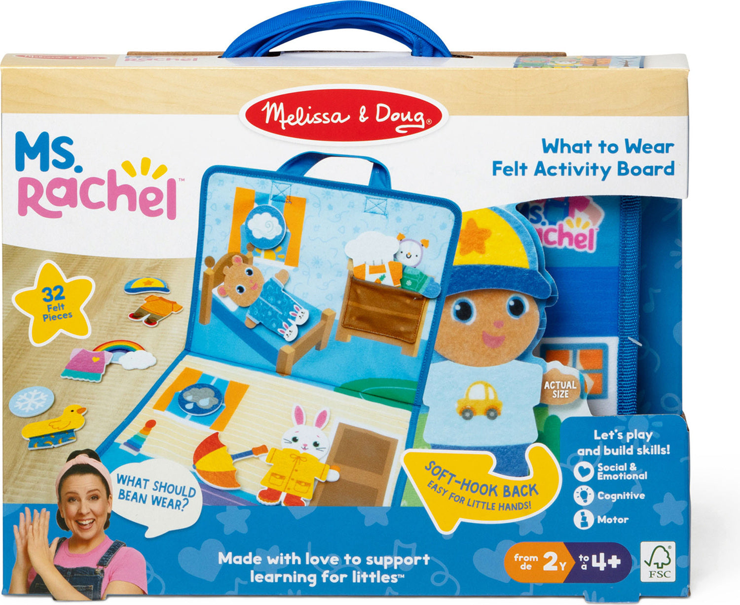 Regular price $32.99Tell stories, practice routines, role play together, and encourage important life skills with popular educator Ms. Rachel! Littles will love dressing up Ms. Rachel's friends Bean and Bunny with fun felt accessories that match each season on a four-scene fold-out felt activity board. The 32 printed felt pieces are backed with soft hook material that sticks to the felt board and other pieces. Everything stores in the illustrated dresser and a sewn-in pocket, so kids can securely bring the fun wherever they go! Play with the board flat or hang it up using the built-in take-along handle. The Melissa & Doug Ms. Rachel play set includes a special bonus Learning Card with play ideas and skill-building tips for caregivers. These Melissa & Doug toys are toddler learning toys, designed by Ms. Rachel and developmental experts, to support all children through their ages and stages, from 2-5+ years. Ms. Rachel toys are ideal newborn toys, toddler toys, preschool toys, and wooden toys. From baby shower gifts to baby essentials, these products help babies and families learn, bond, and thrive. Ms. Rachel is a real teacher and passionate educator, with two master's degrees in education, who creates research-based videos and products to support learning for littles.