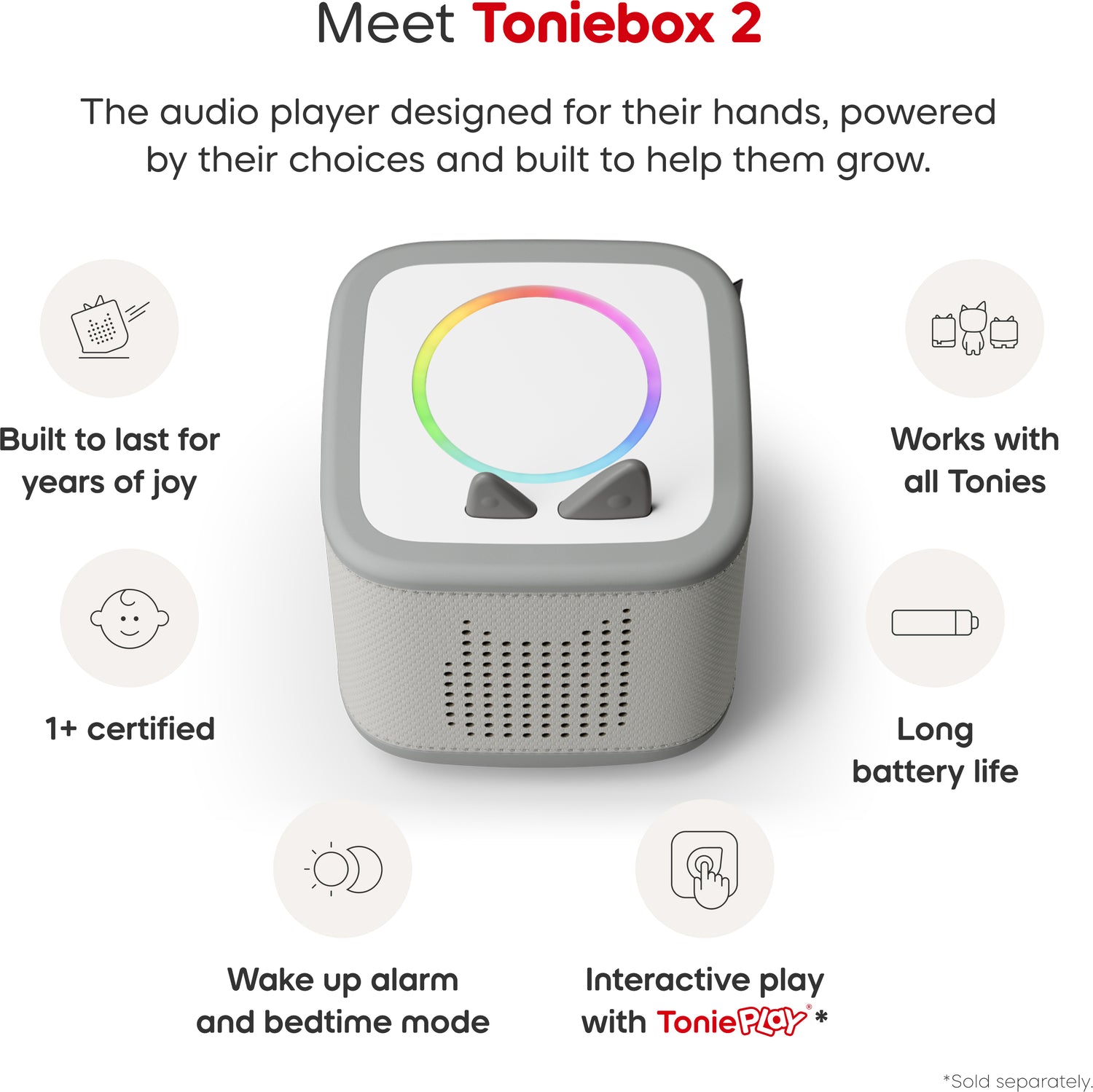 GROWS WITH YOUR KIDS Designed for ages 1–9+, Toniebox 2 is built to last with hundreds of Tonies and Tonieplay games to choose from.