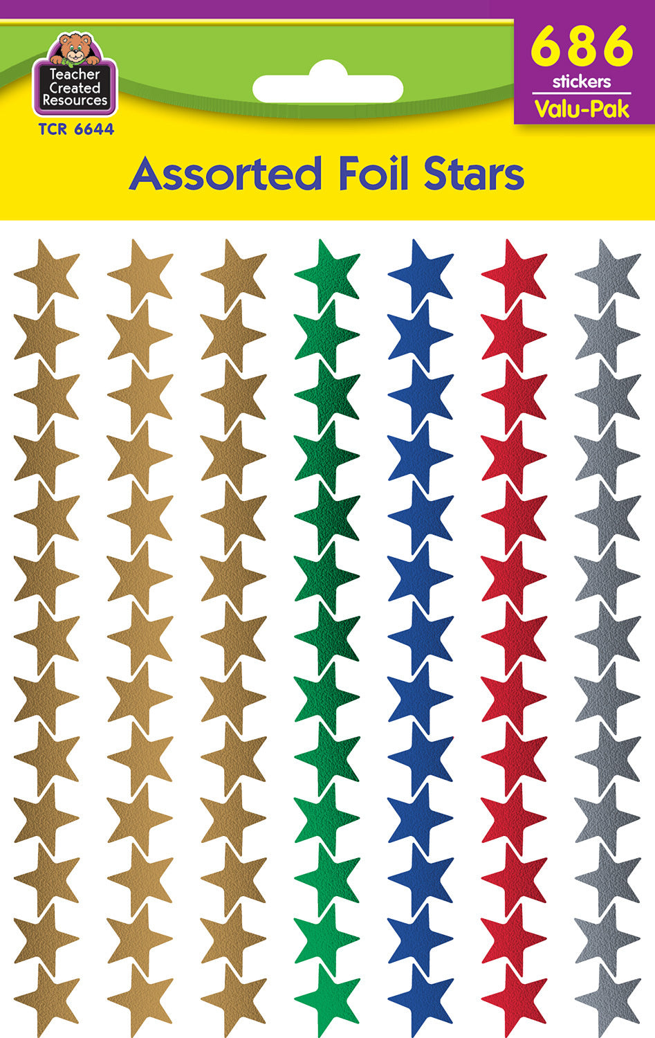 Regular price $7.99Assorted Foil Stars Stickers Valu-Pak - Get a great deal on super-sized valu-paks of stickers! Teacher Created Resources stickers are acid-free. Each sticker is approximately 1/2 inch in diameter. This Valu-Pak contains 686 stickers.