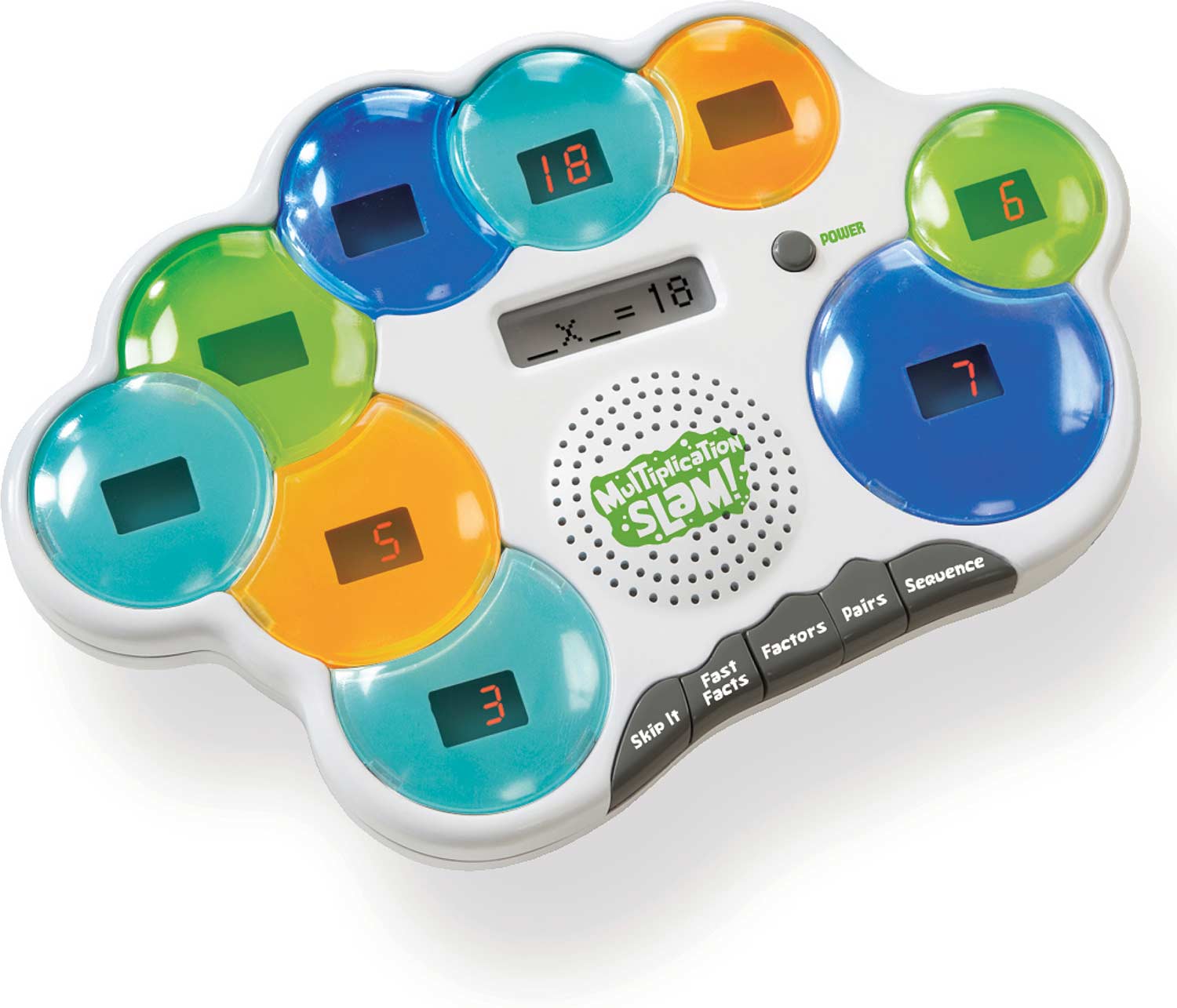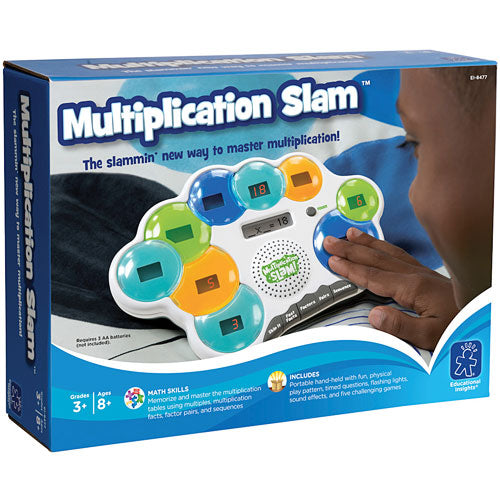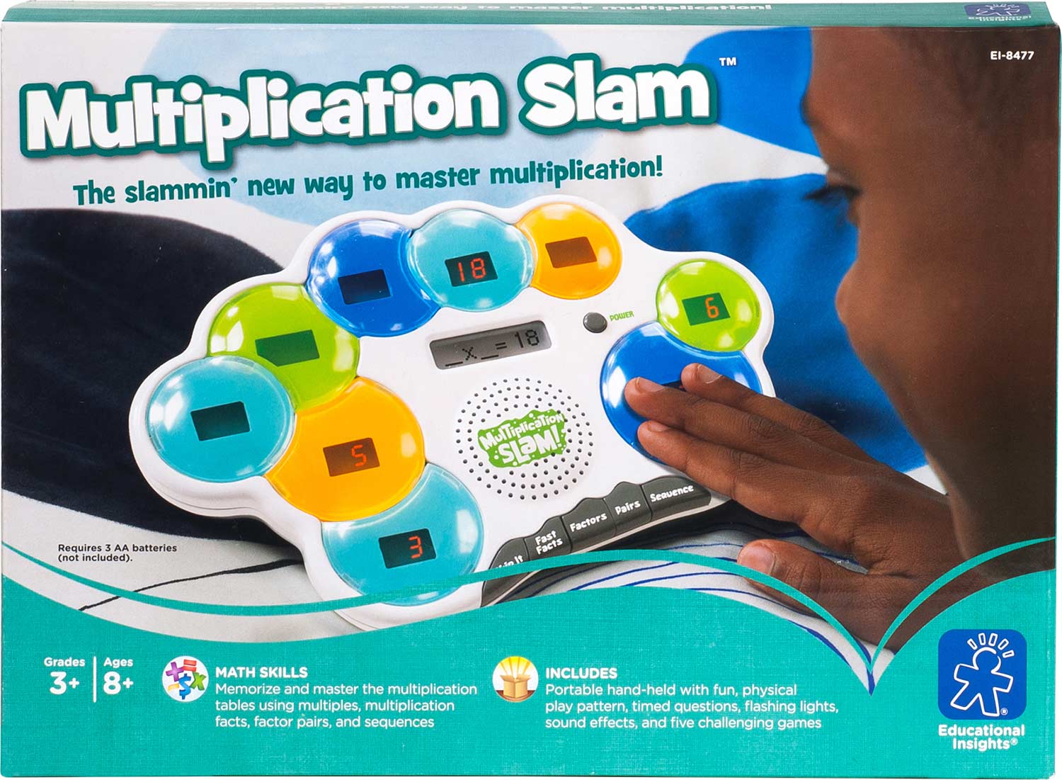 Multiplication Slam Memorize multiples, math facts, factors, factor pairs, and sequencing with five slammin' math games in one! - Includes portable handheld device with timed questions, flashing lights, sound effects - 5 Fun games for self-paced multiplication reinforcement - Ticking clock and rocking rhythm keep students engaged - Requires 3 AA batteries (not included) - Grades 3+/Ages 8-10