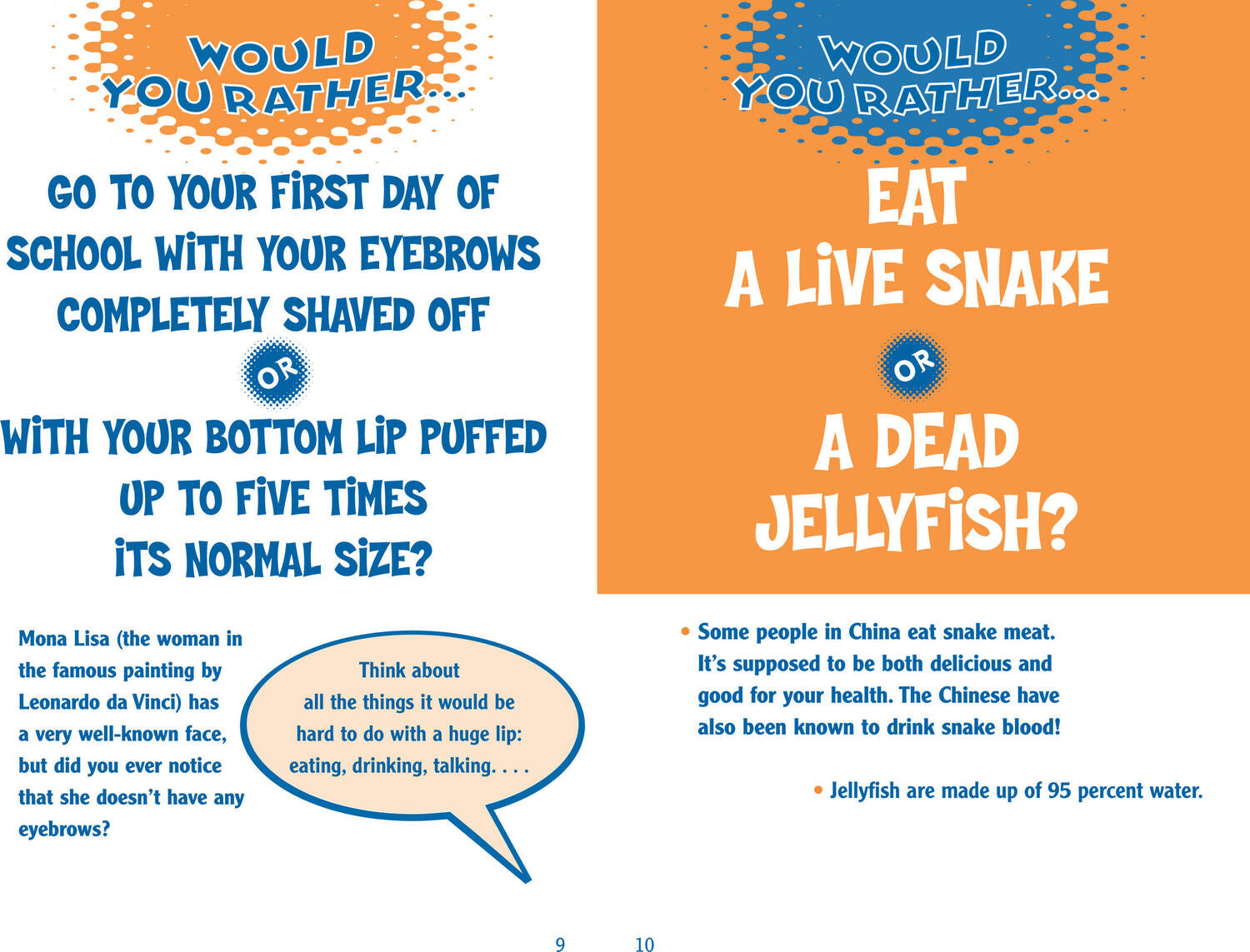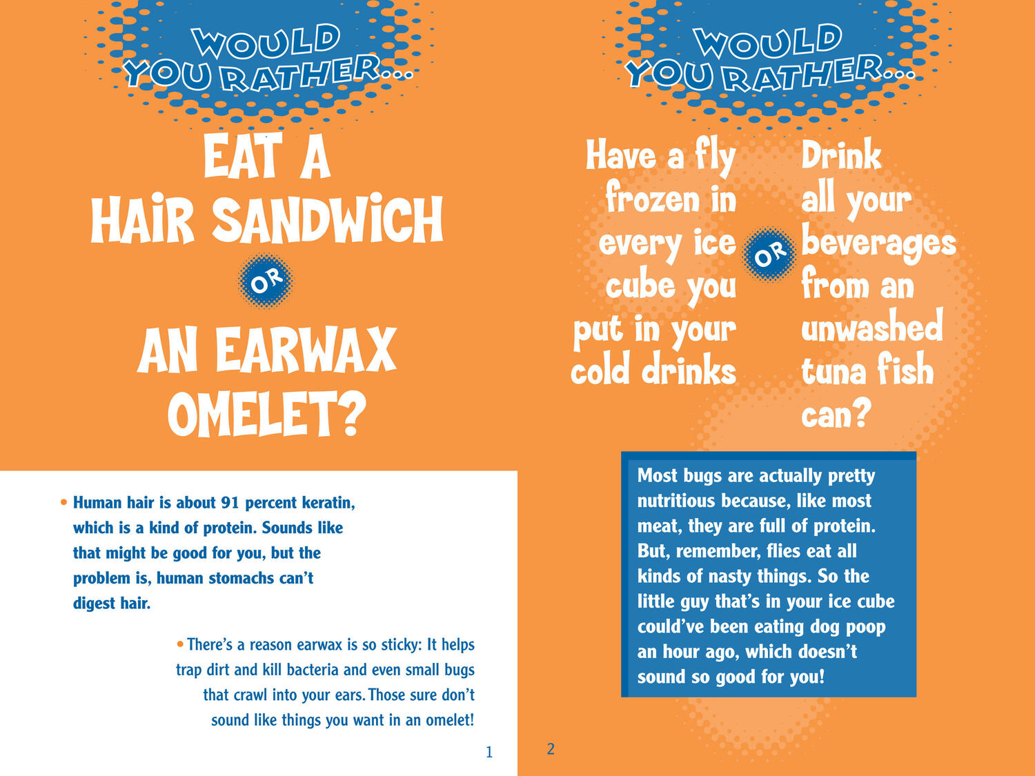 Ponder the icky: Would you rather eat 10 pounds of cheese -OR- a bucket of peanut butter—with nothing to drink? The exponentially icky: Would you rather drink liquid found leaking from a garbage can -OR- chew on a hairy clump found between the cushions of an old couch? The fantastic: Would you rather be able to talk with all animals -OR- be able to understand all languages? The priority-testing: As a soccer player, would you rather mess up and score a goal for the other team but still have your team win -OR- play your best game ever even though your team loses? And the hair-raising: Would you rather swim across a river that is filled with crocodiles -OR- spend the night on an island where man-eating tigers live? Fascinating sidebars throughout are filled with interesting ancillary information—the nature of drool, left-handedness vs. right-handedness, what’s dangerously filthy and what’s just gross, why we blush when we’re embarrassed—so kids can learn something as they laugh!