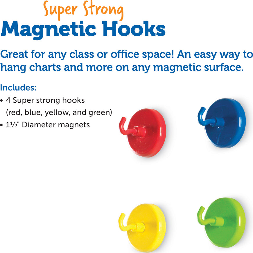 Regular price $21.99Super Strong Magnetic HooksFree up more wall and bulletin board space by storing materials on metal filing cabinets and other magnetic surfaces. Great for hanging pocket charts, flipbooks, decorations, hall passes and more. Our new colorful Super Strong hooks measure 1.5" diameter and holds 20 lbs each.LER 2694 Set of 4